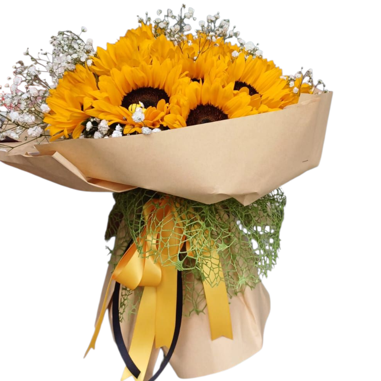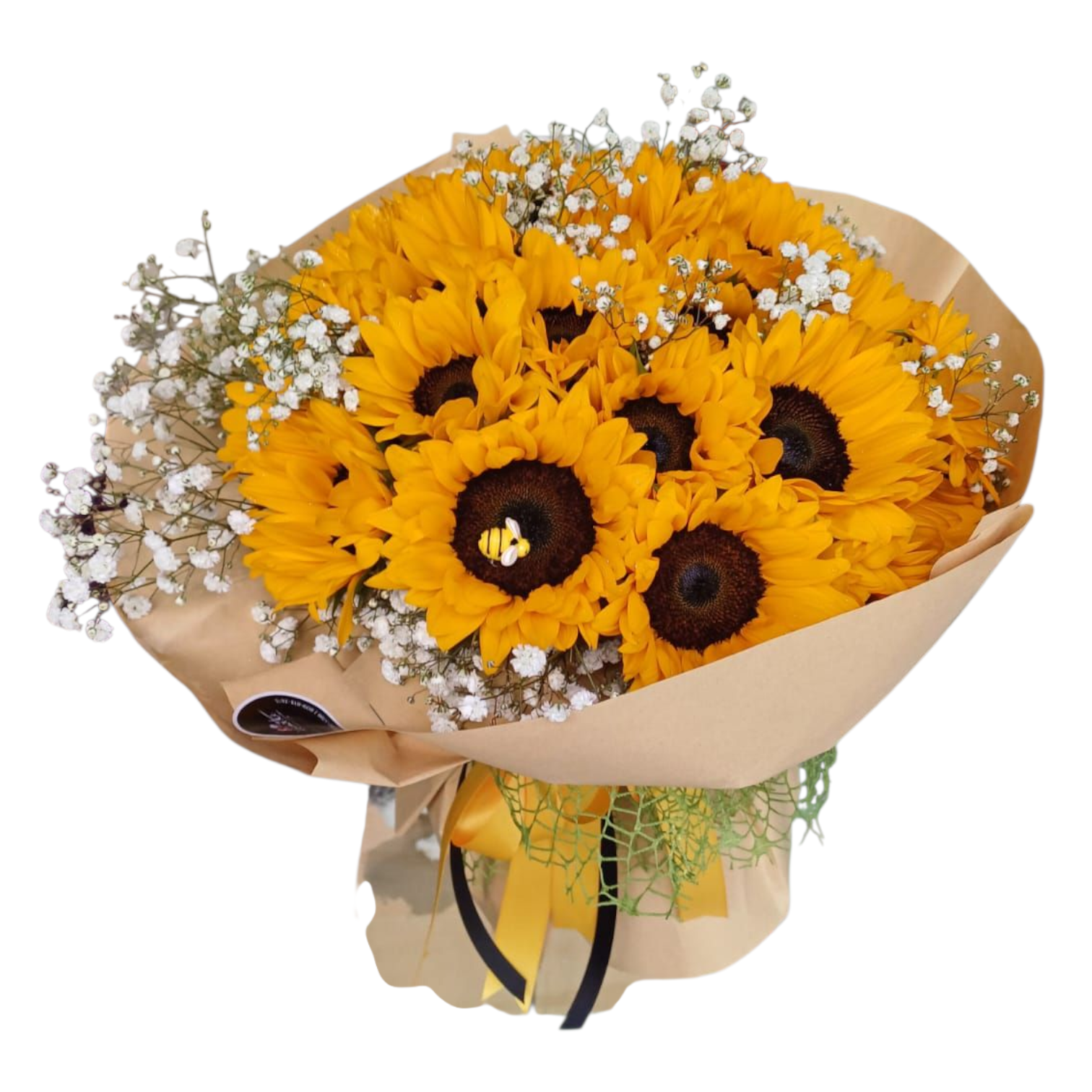 Un abrazo de sol: 25 girasoles iluminados por nubes de baby breath. Regala luz, regala amor.