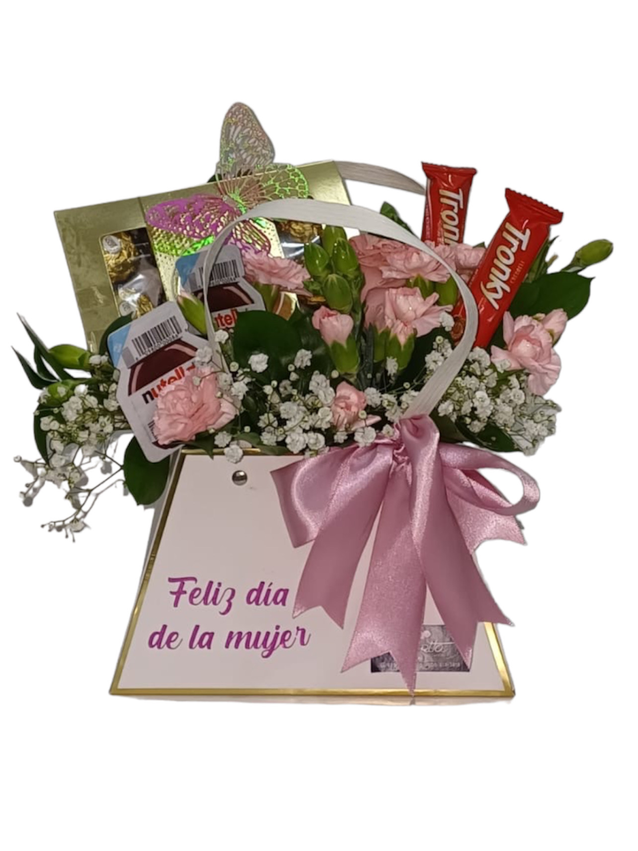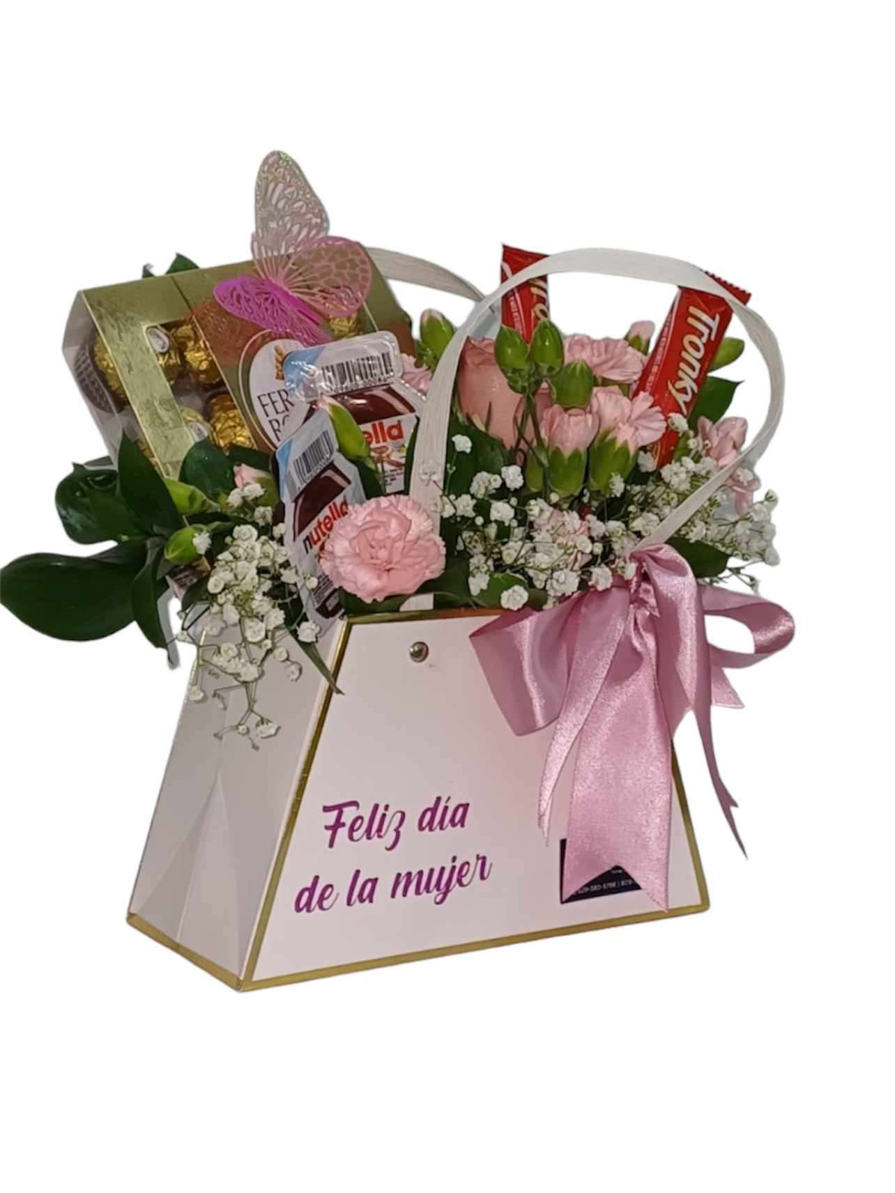 Caja forma cartera surtida con 01 rosa, claveles, ruscus, baby breath; con chocolates Nutella y bombones Ferrero Rocher. Incluye personalización de la caja.