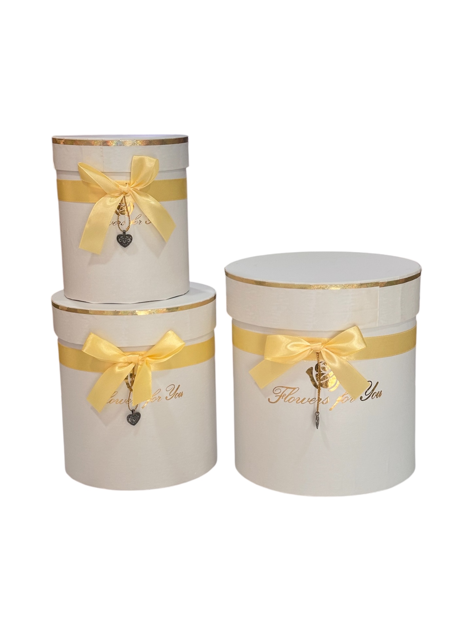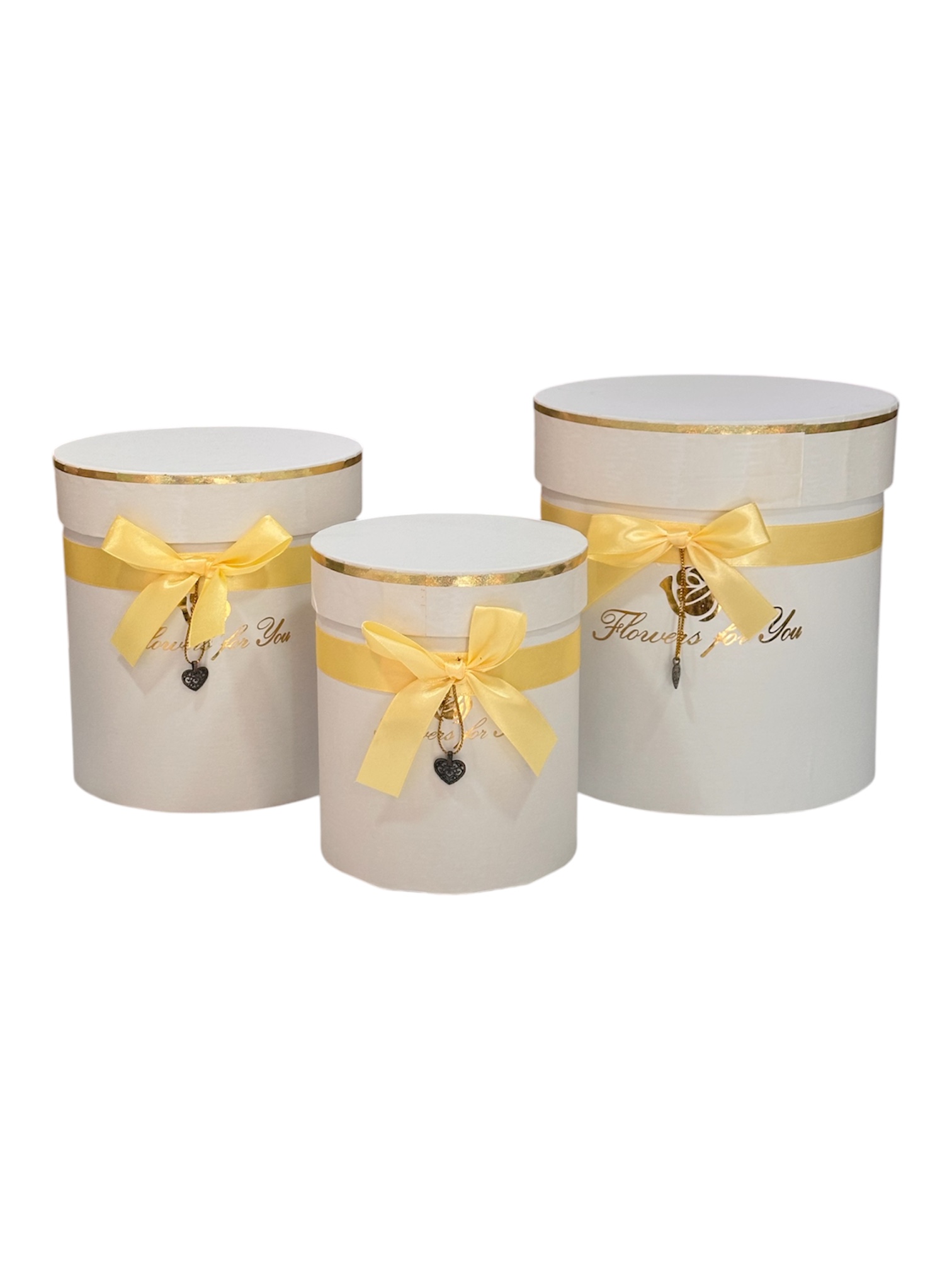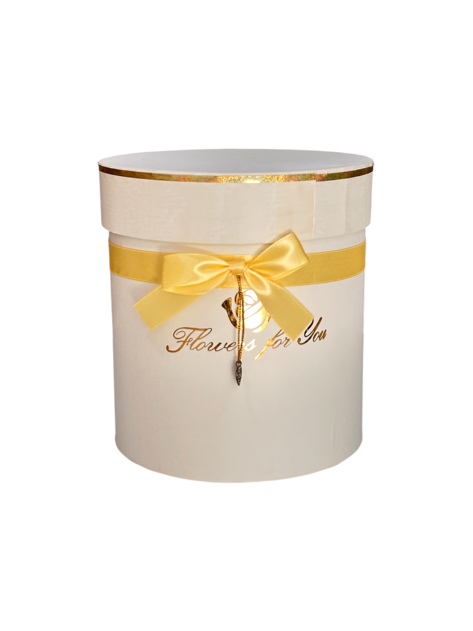 Caja circular alta «Flowers for you» con lazo y corazón colgante
