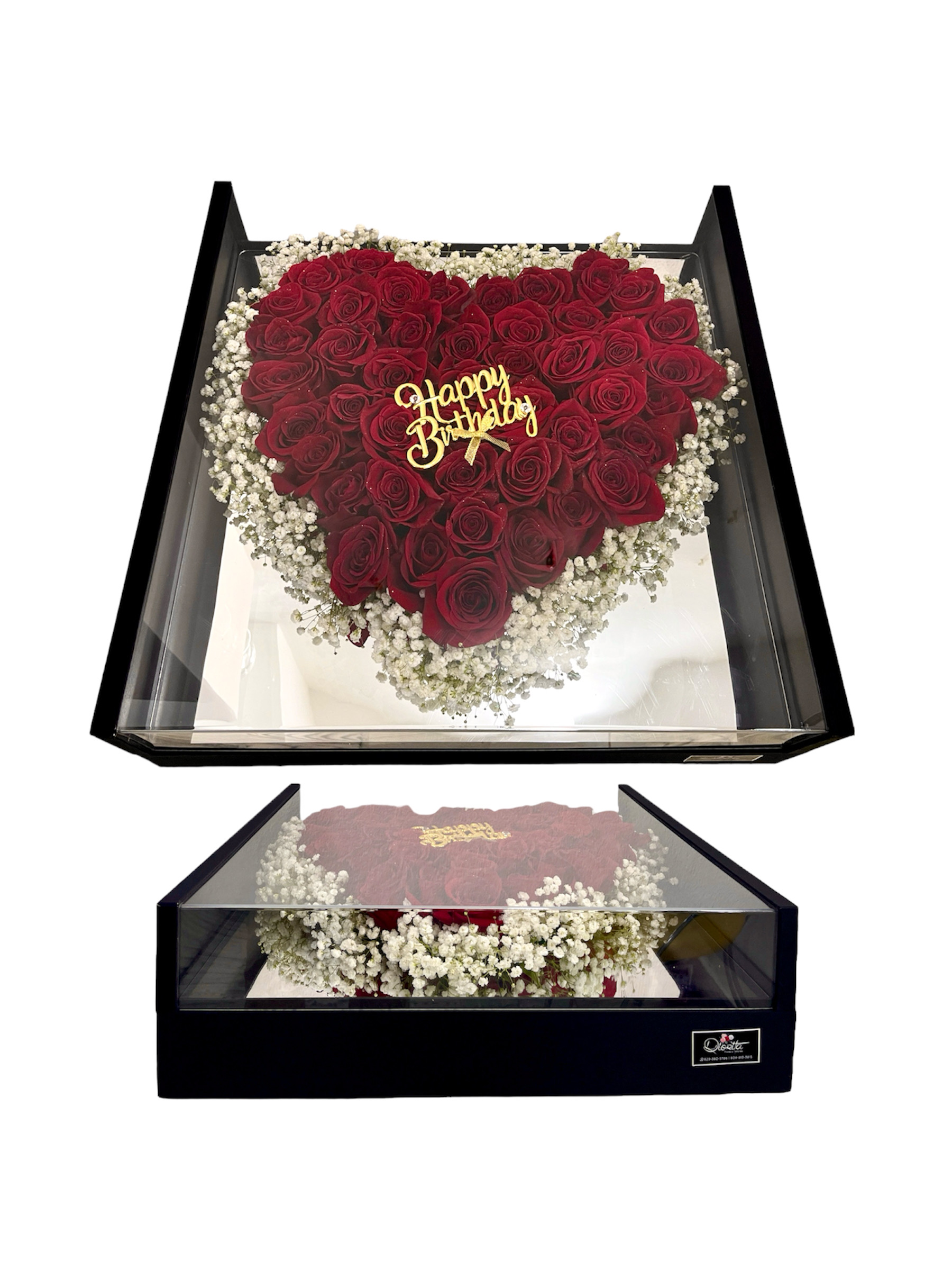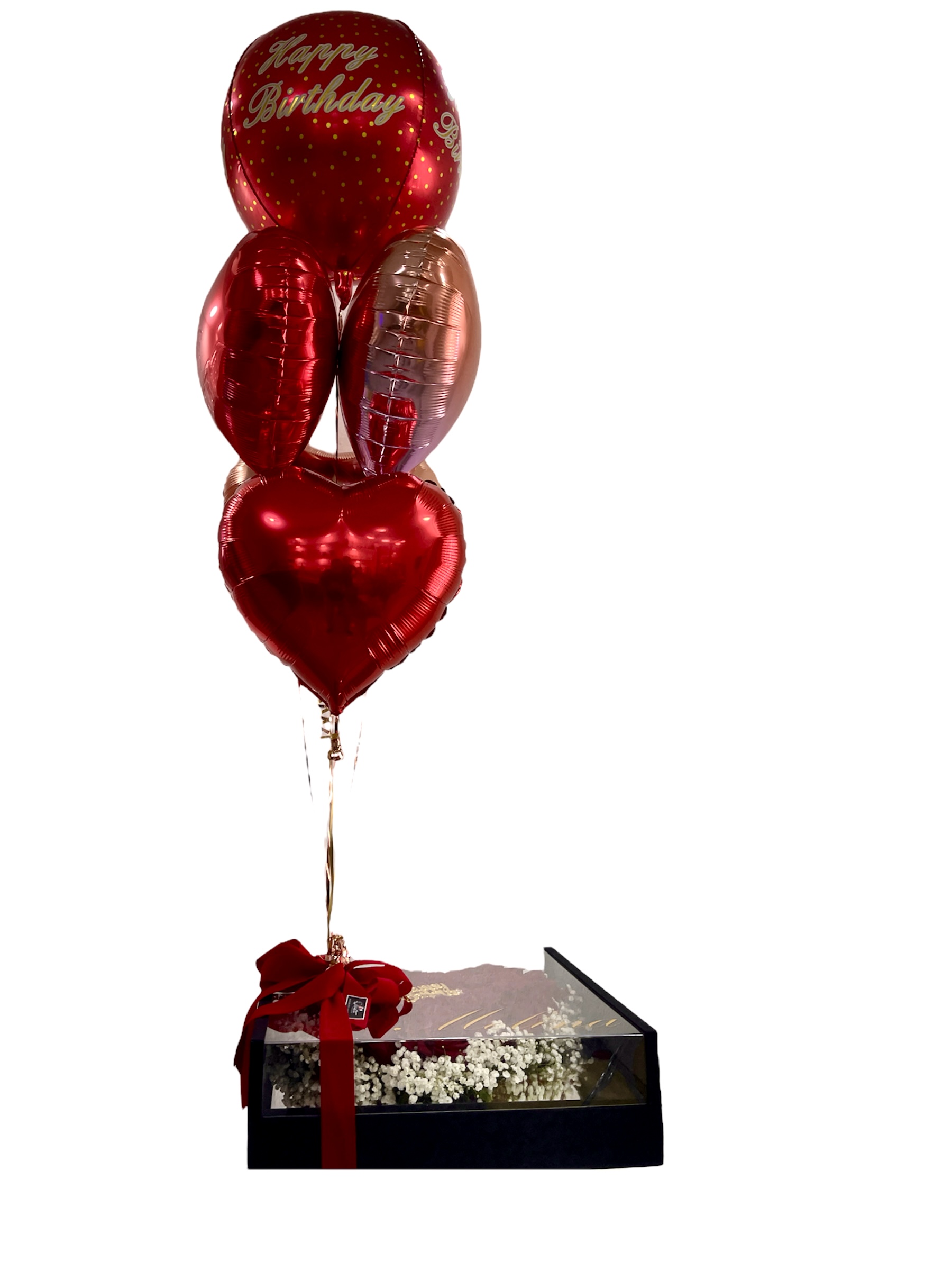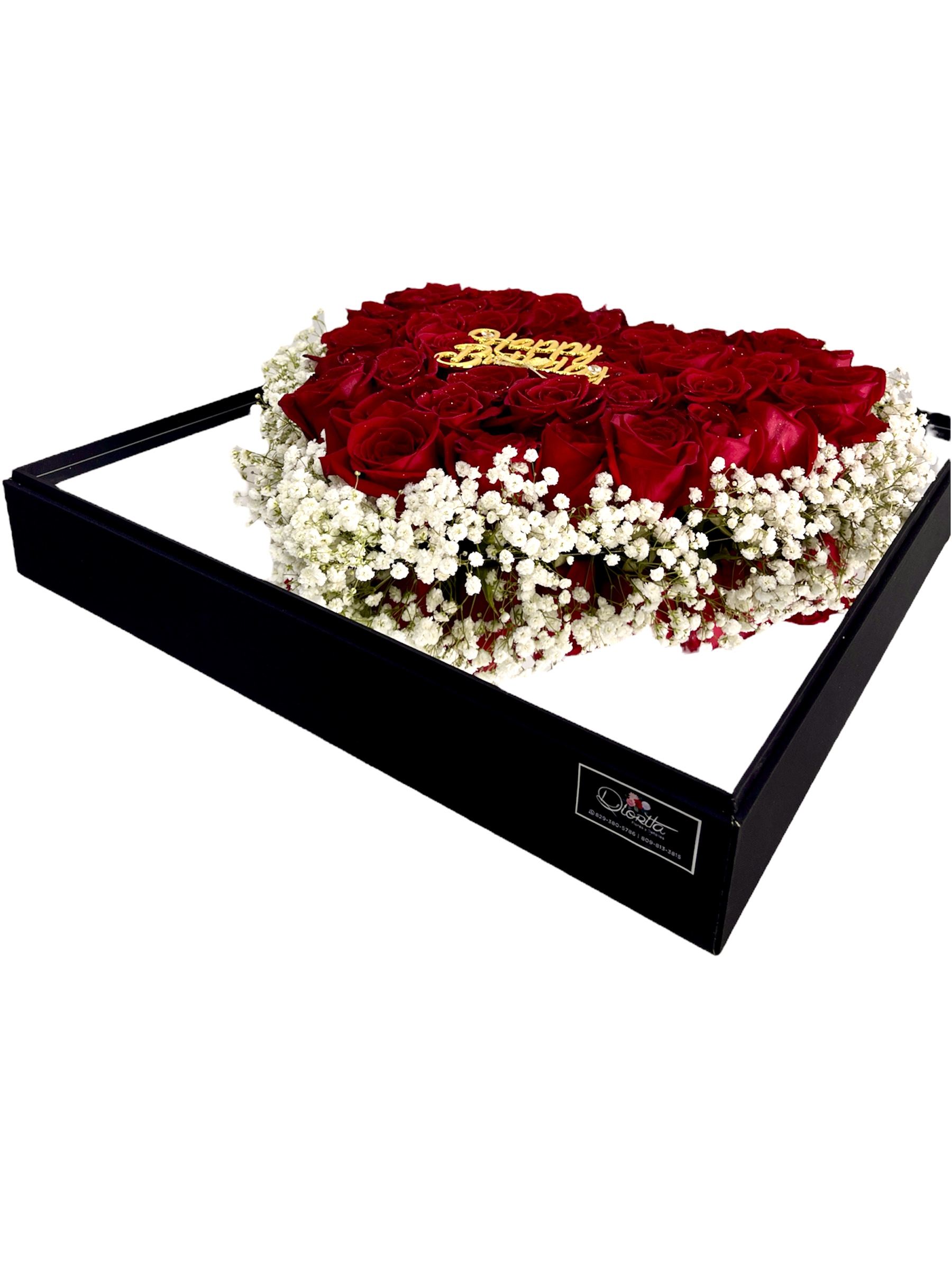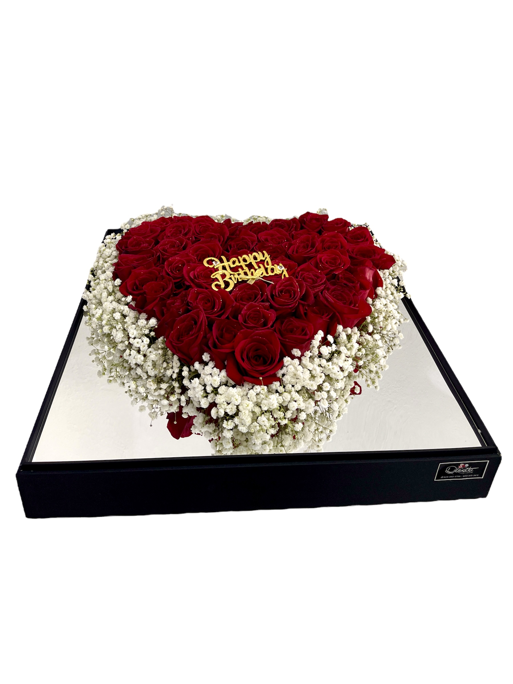 Caja cuadrada tope acrílico con corazón en el fondo plateado, surtida de 50 rosas bordeadas de baby breath. Topper Happy Birthday dorado. Es opcional adicionar globos y con costo extra.