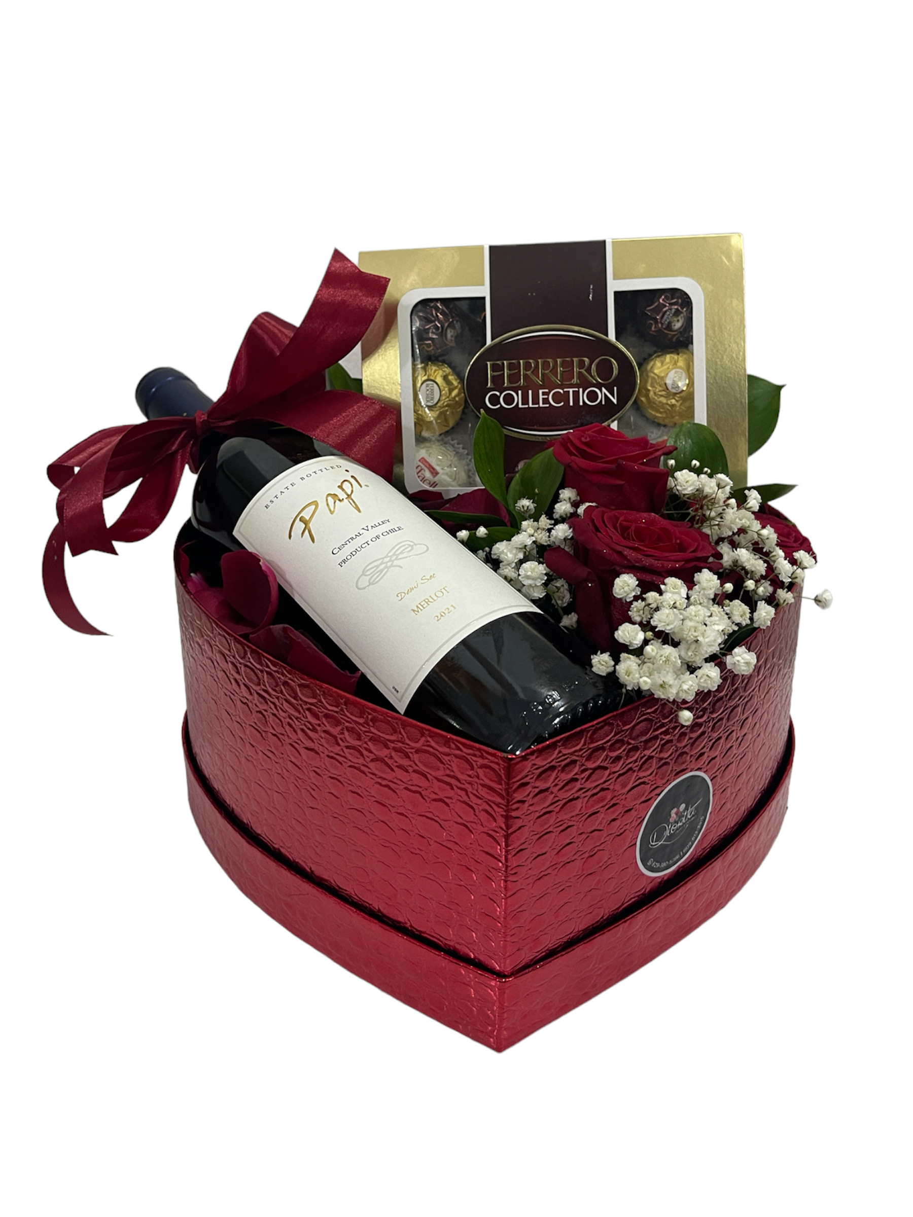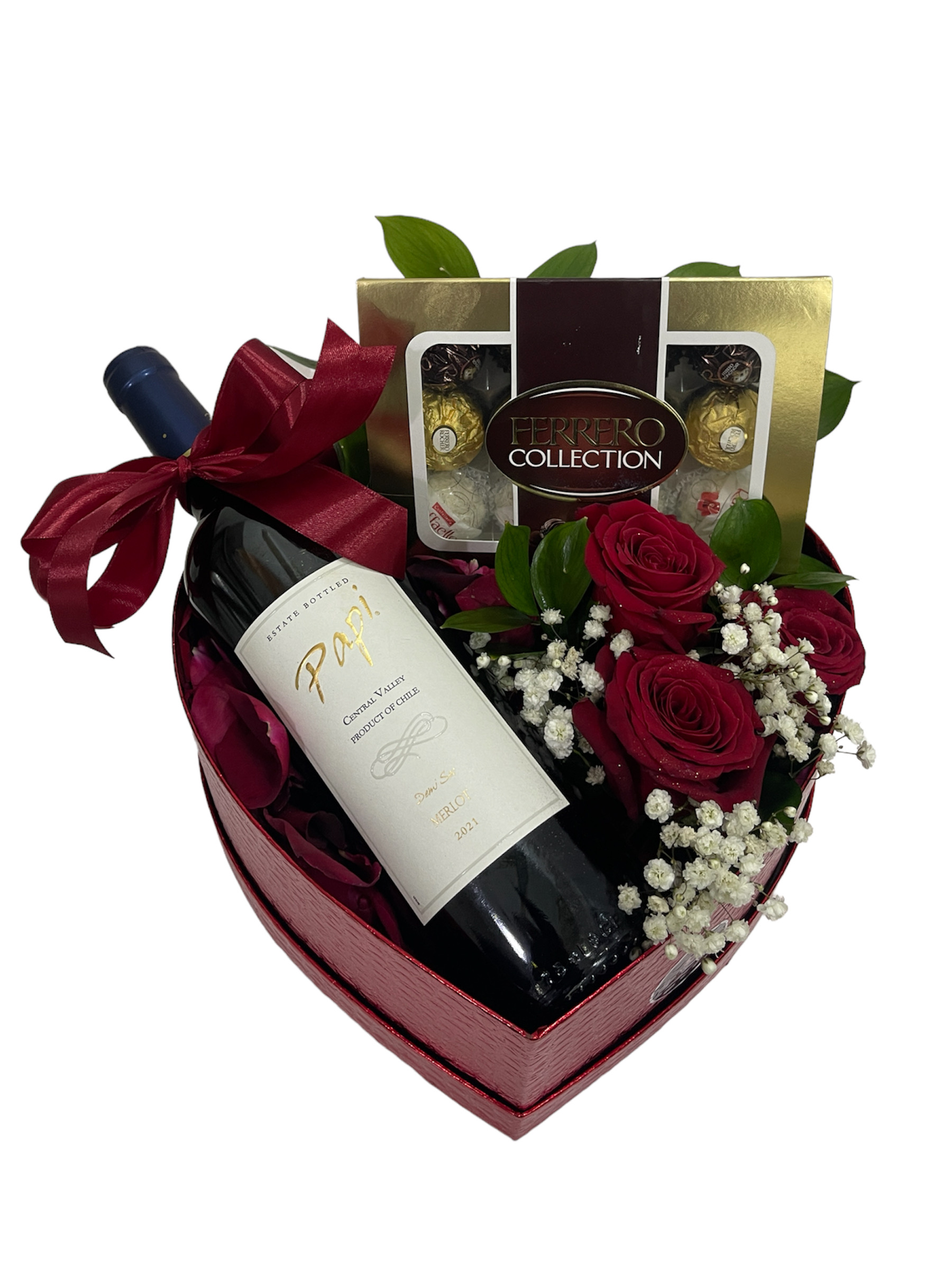 Caja forma corazón surtido de rosas con detalles de baby breath y ruscus, botella de vino , caja de bombones Ferrero Rocher.