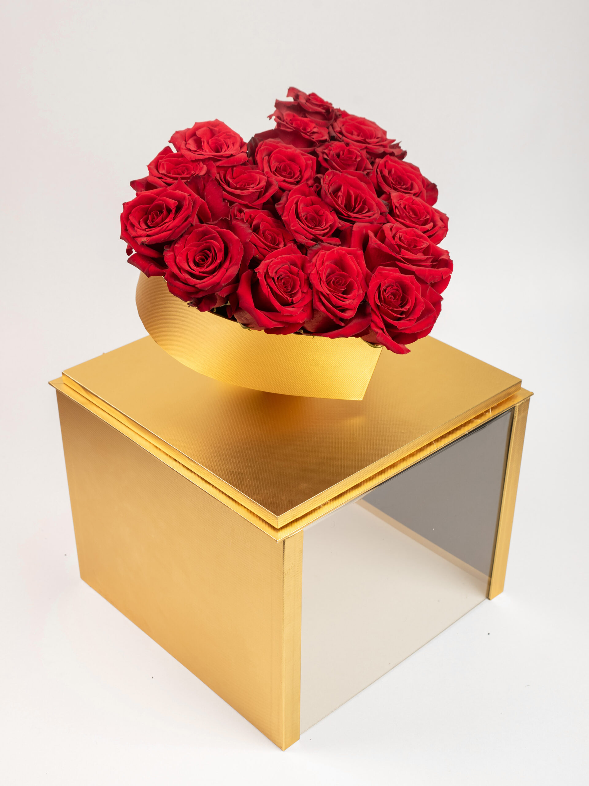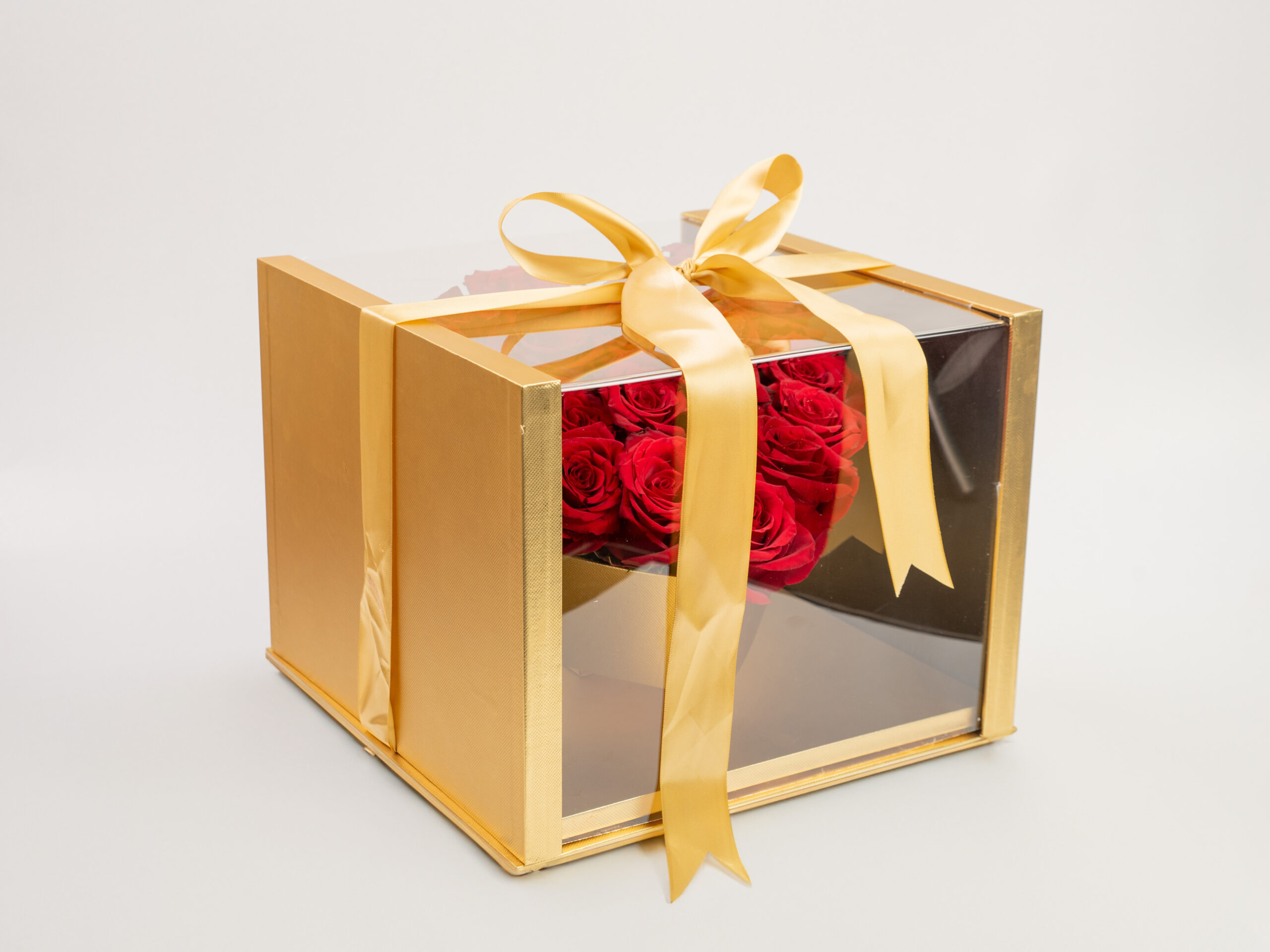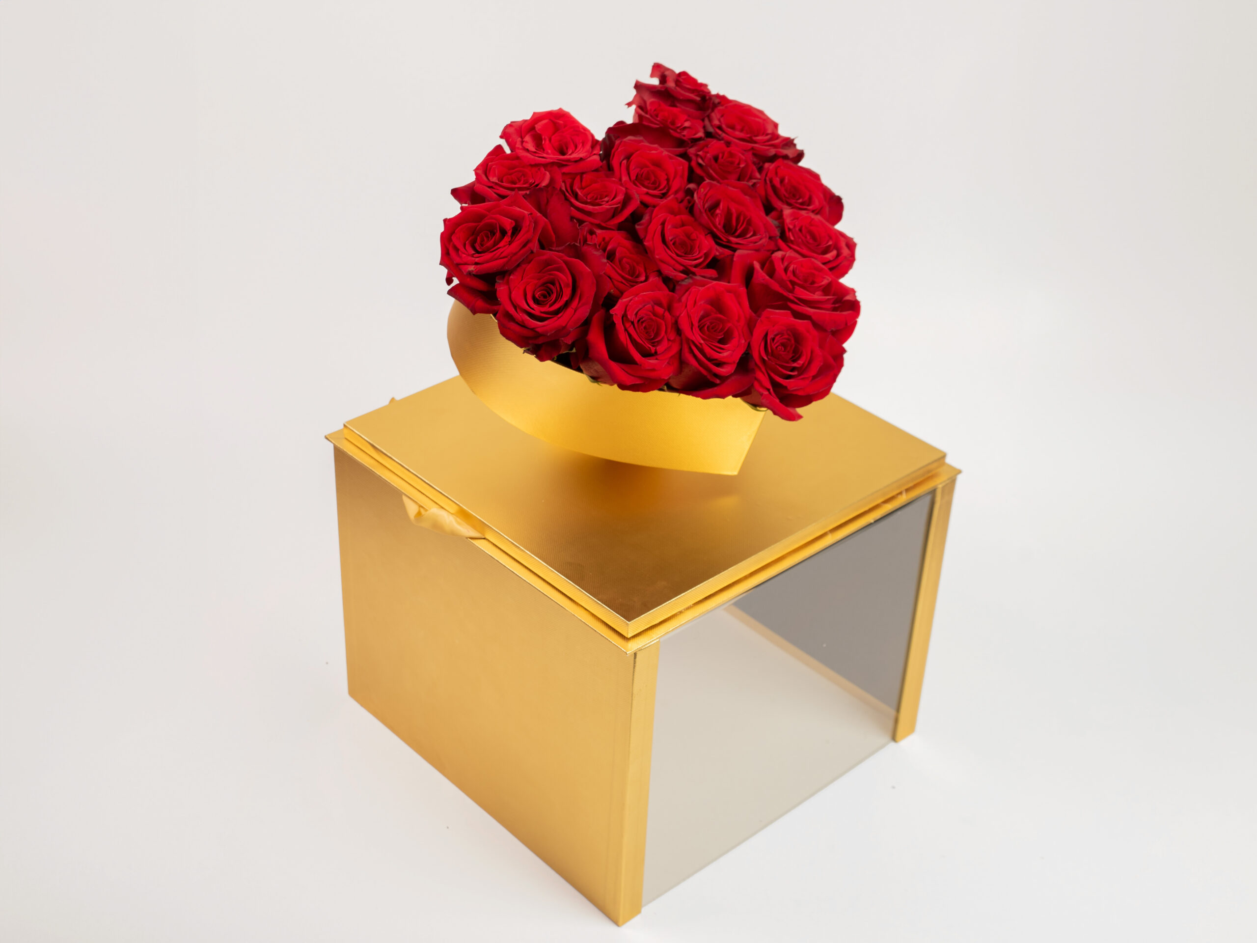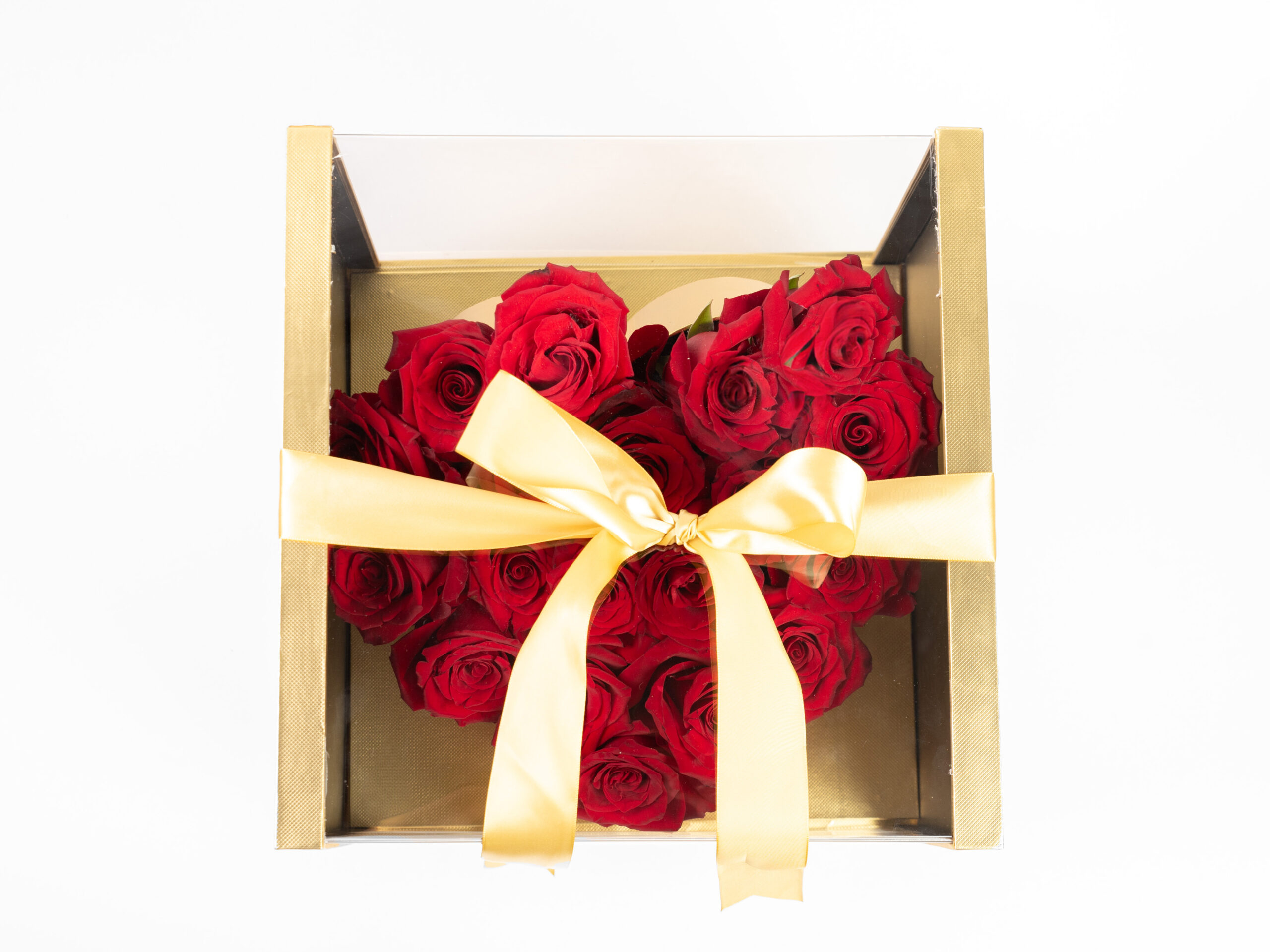 Caja con tope acrílico y corazón elevado surtido de 20 rosas importadas. Esta caja permite colocar bombones con costo adicional; solo especifícalo en el pedido indicando la cantidad deseada o agregándolo en el pedido.