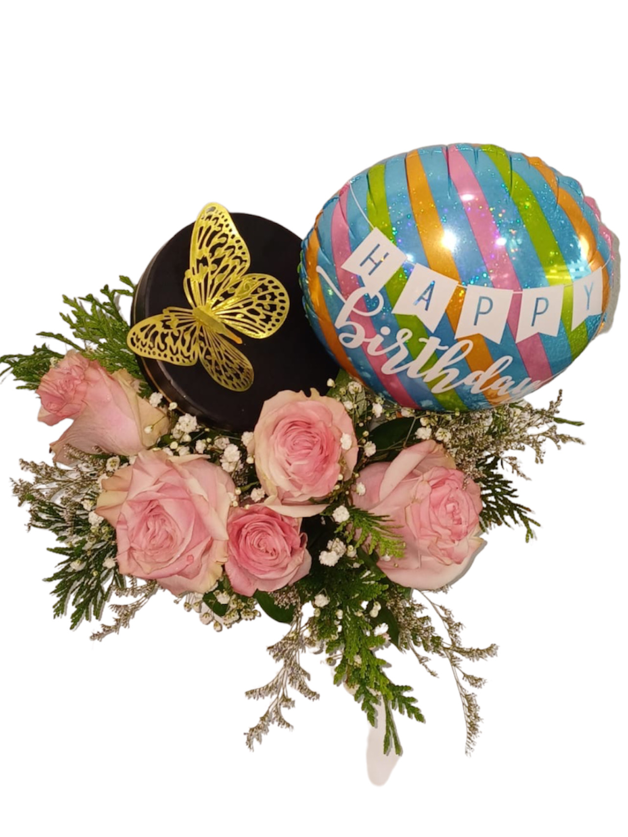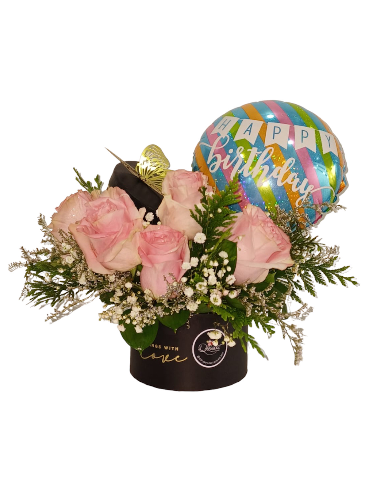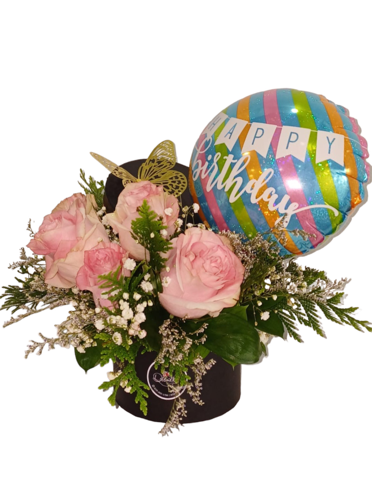 Caja circular pequeña surtida de 05 rosas importadas con detalles de baby breath y globo #9 «Happy Birthday». Globo puede variar a selección del cliente.