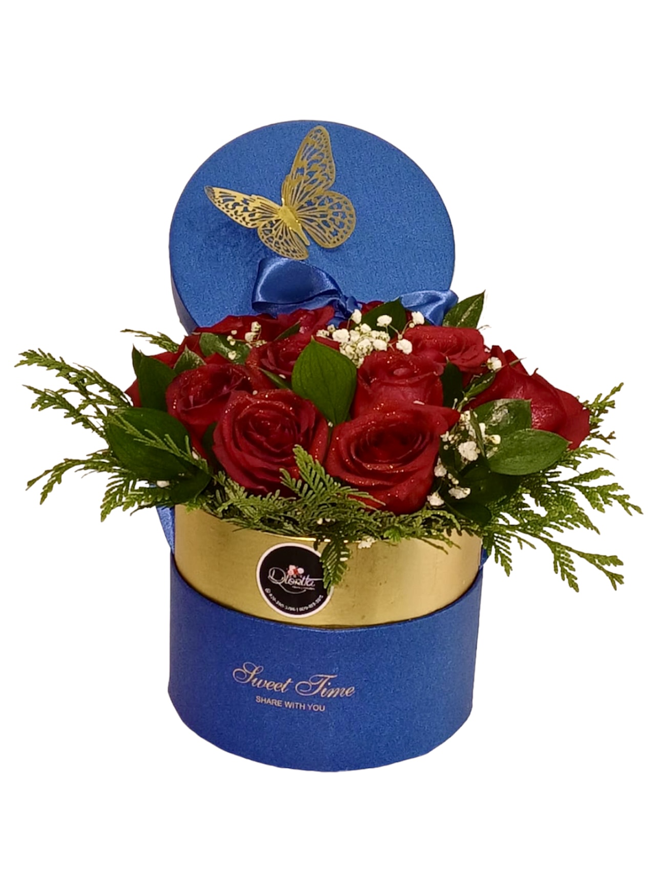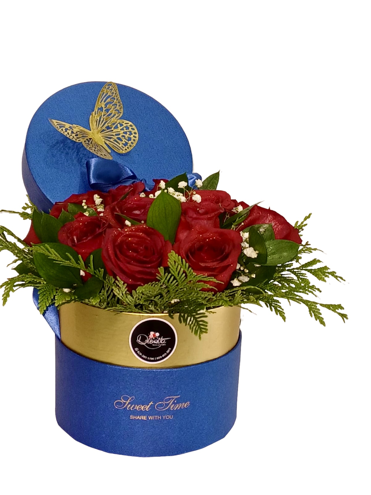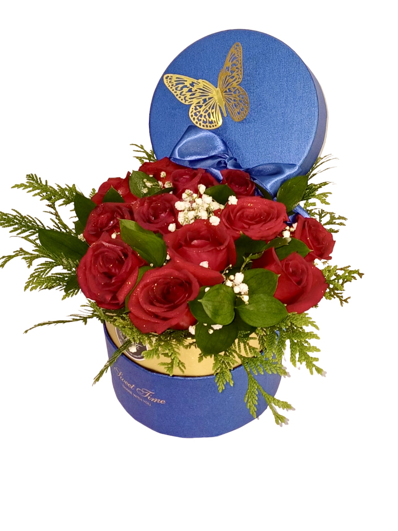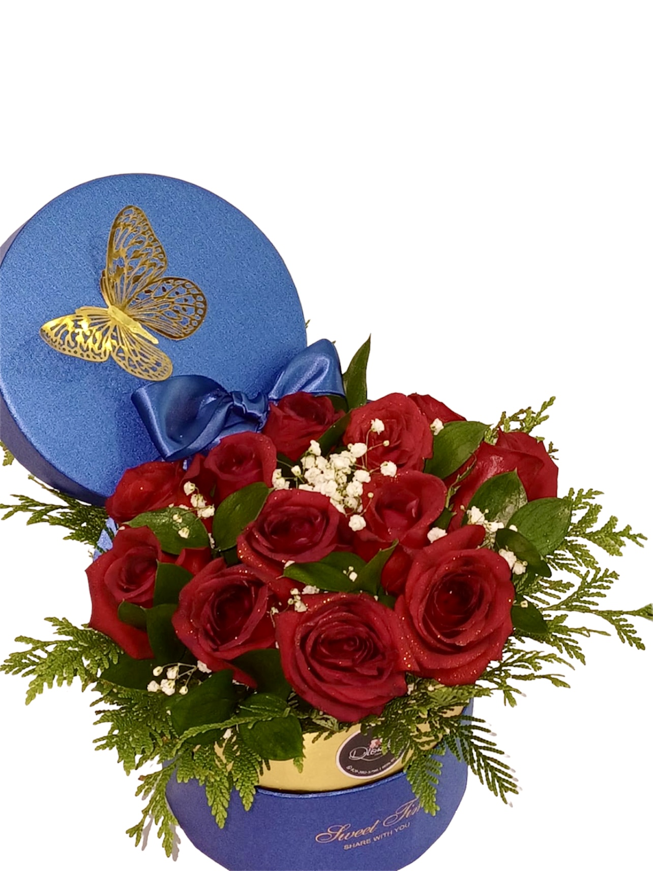 Caja Luxury surtida de 12 rosas importadas con detalles de baby breath. Mariposa decorativa.