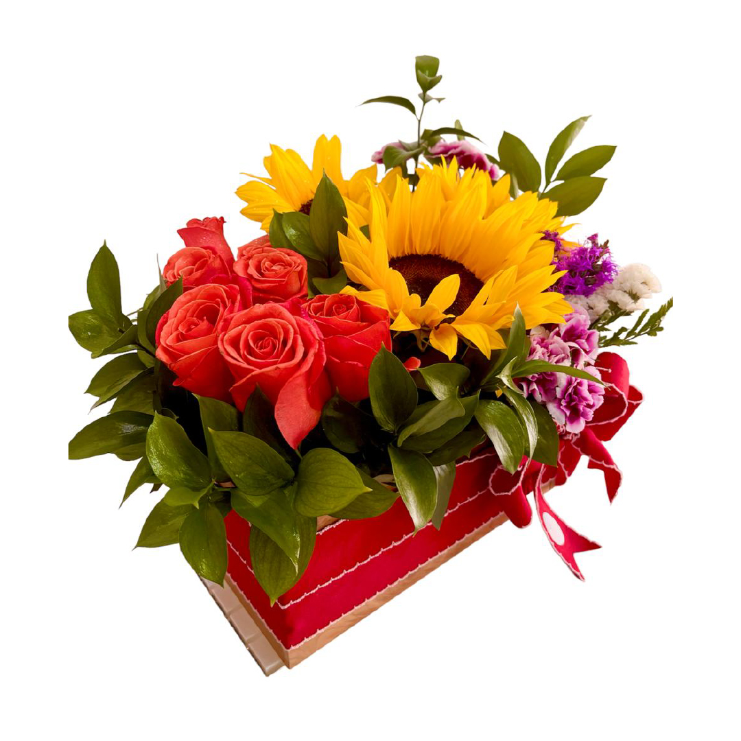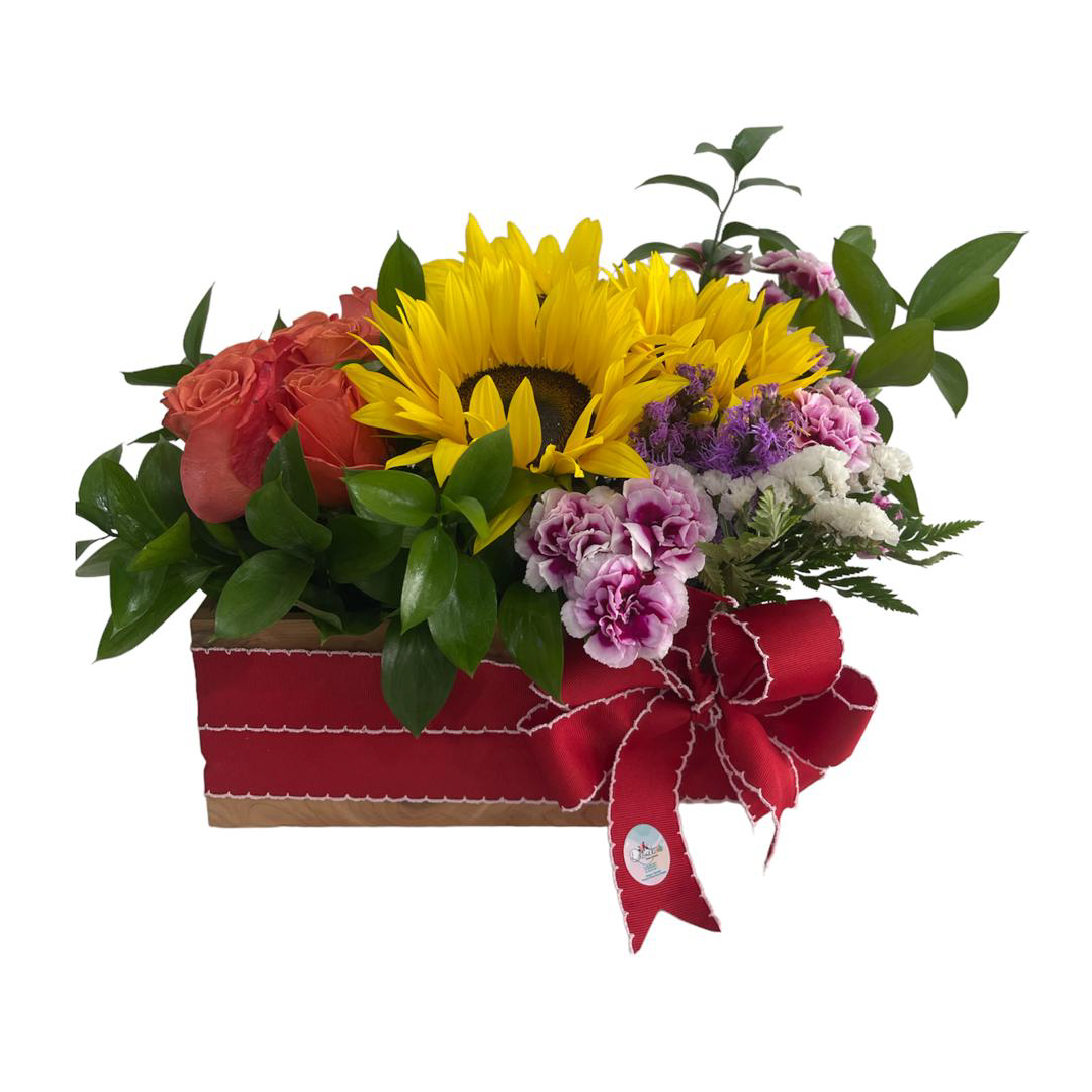 Caja en madera surtida de rosas, girasoles y mini claveles; relleno verde.