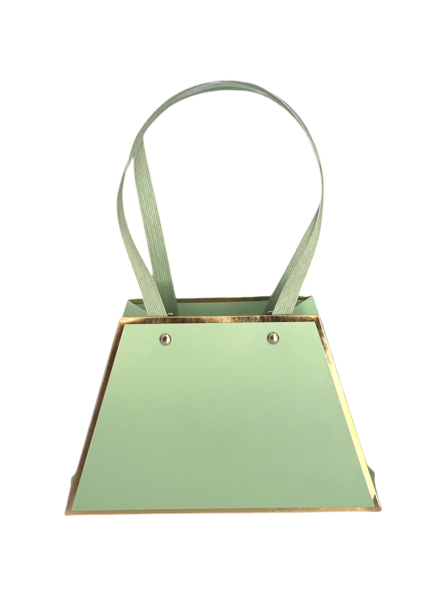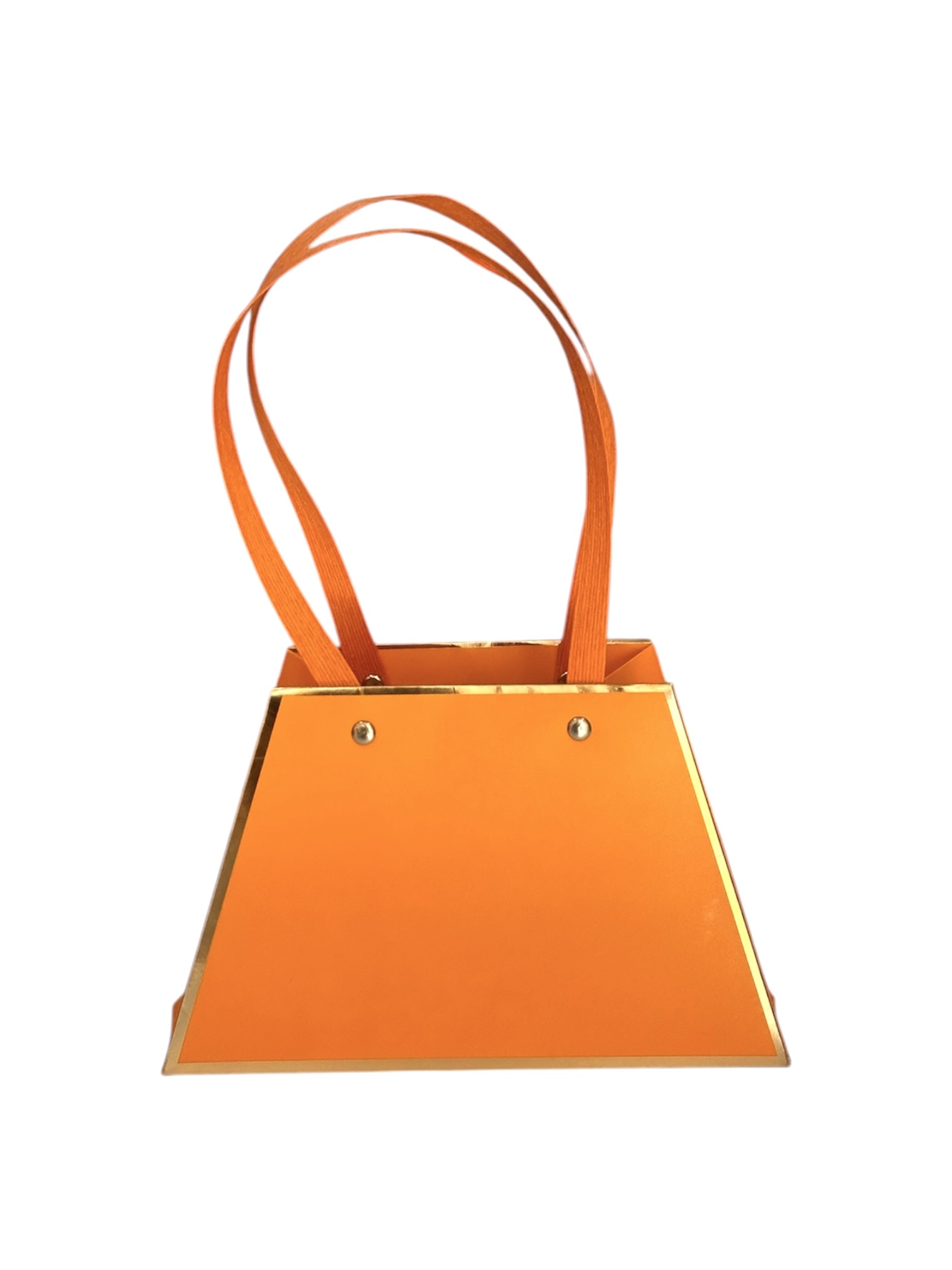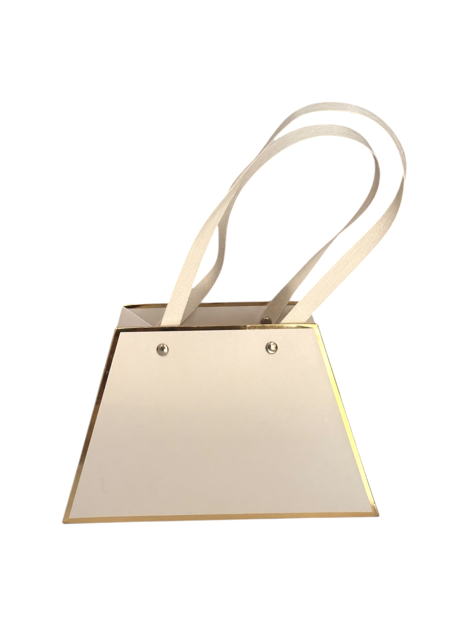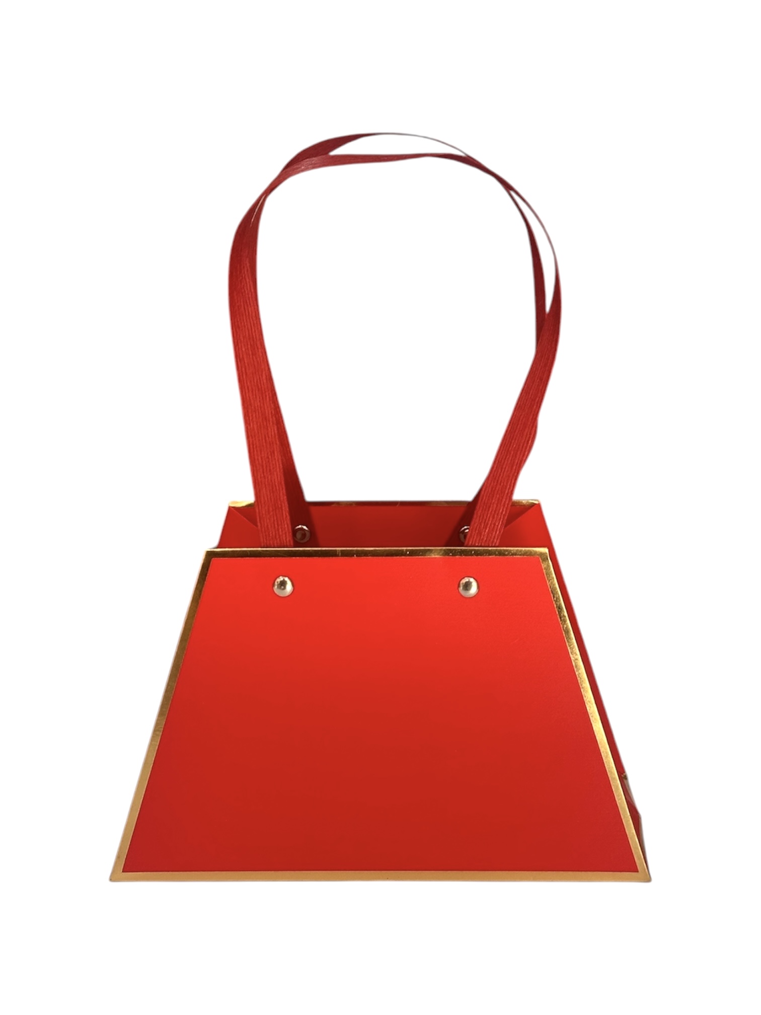 Caja forma bolsa de regalo decorativa para arreglos florales, con obras detalladas, estructura resistente y agarradera plástica.