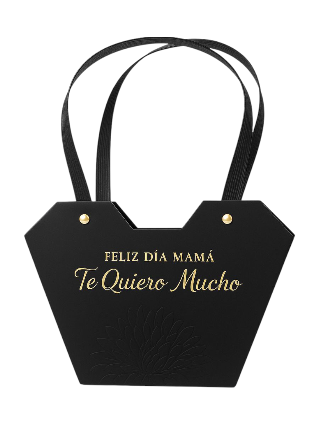 Elegancia en cada detalle: sorprende a mamá con esta fina caja en forma de cartera negra, perfecta para presentar flores, chocolates o regalos especiales con un toque chic y sofisticado.