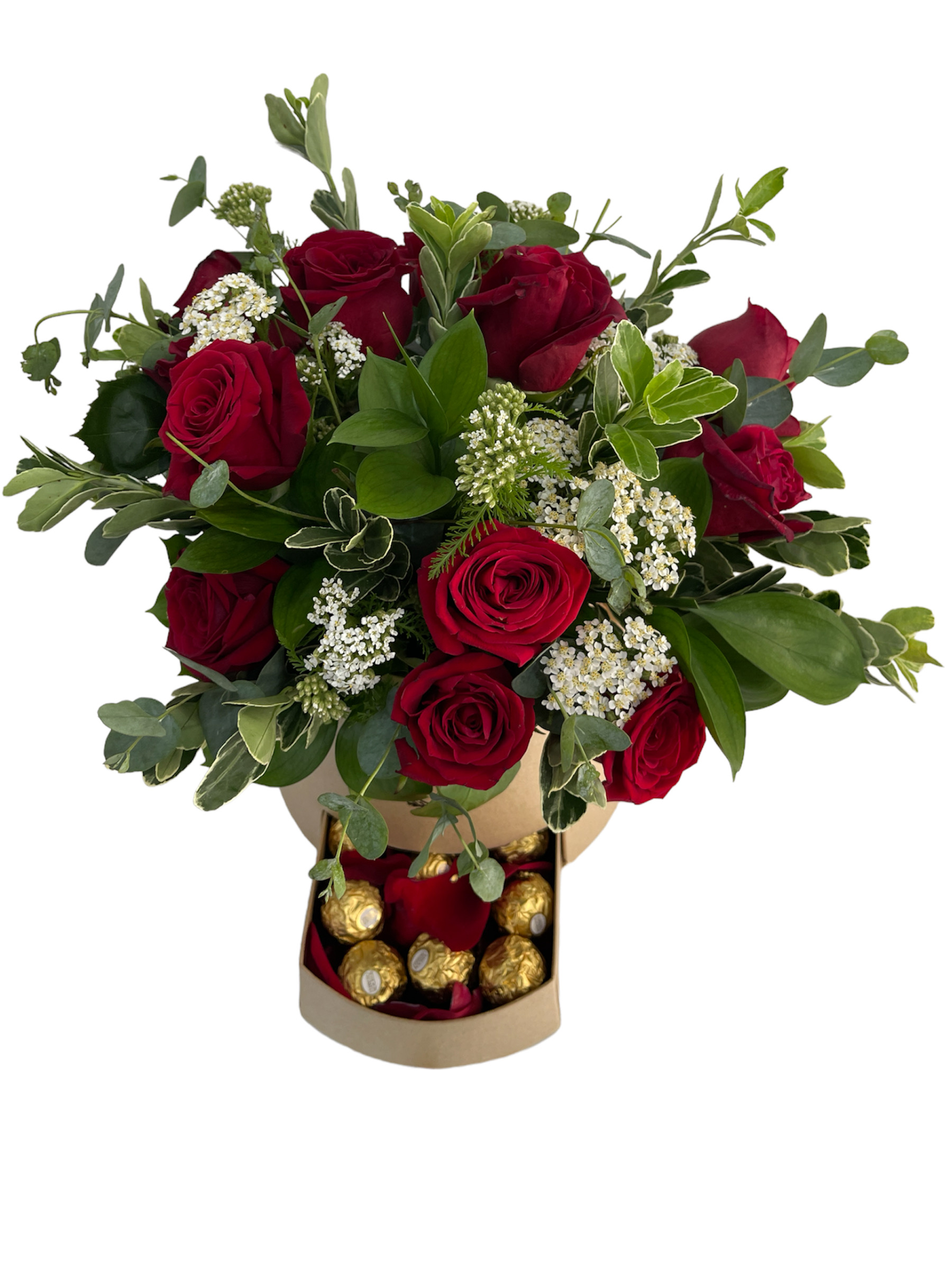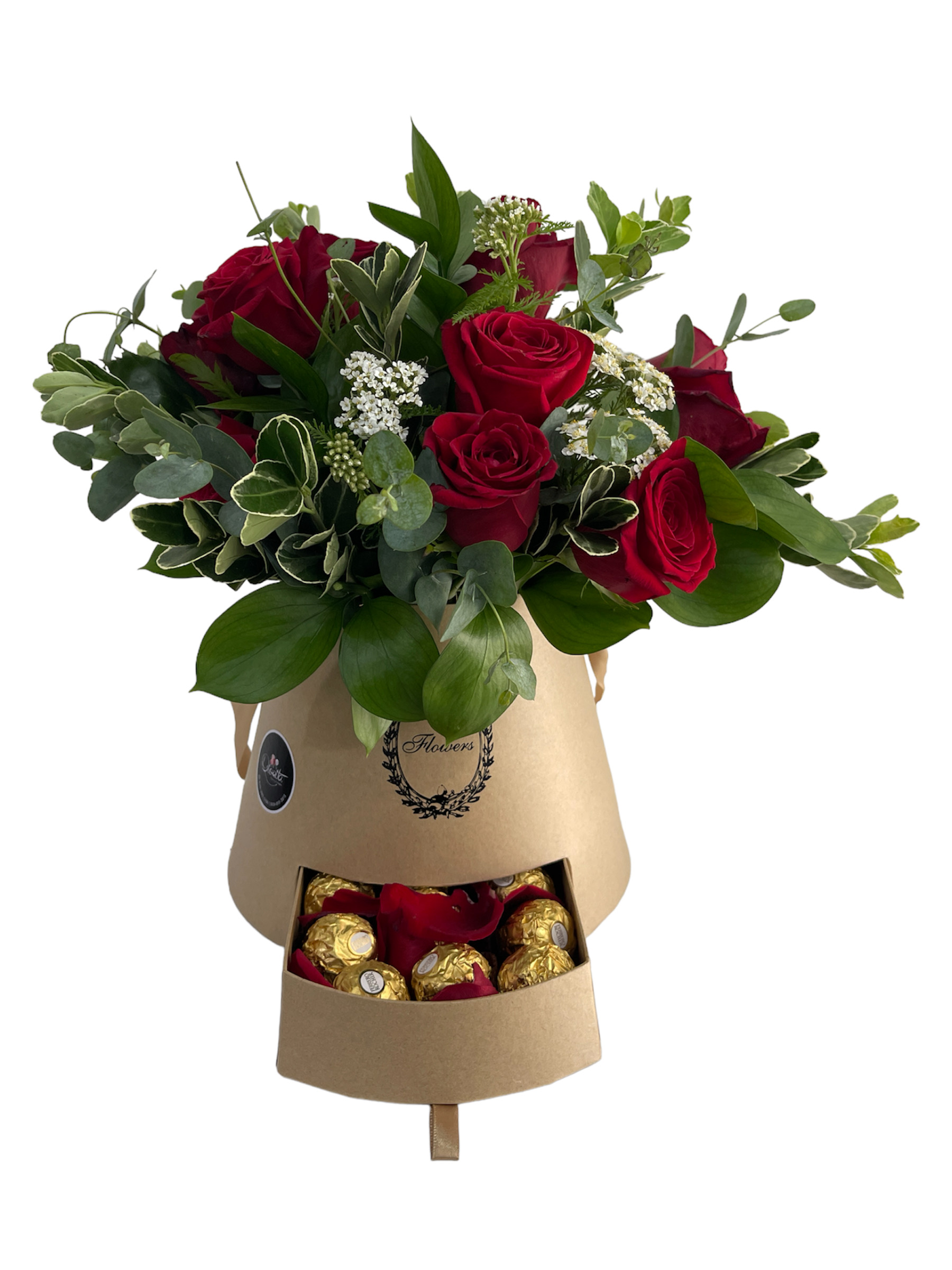 Caja forma cónica con gaveta surtida de 12 rosas importadas y relleno verde con bombones Ferrero Rocher.
