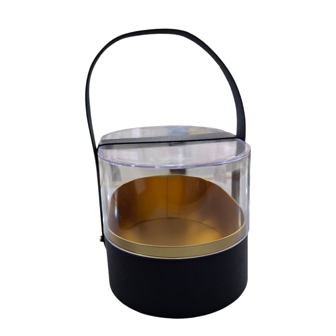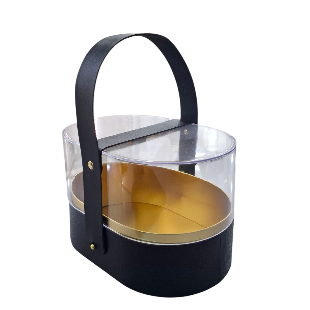 Caja ovalada tipo bolso con tope acrílico y manga en vinil R12x19cms