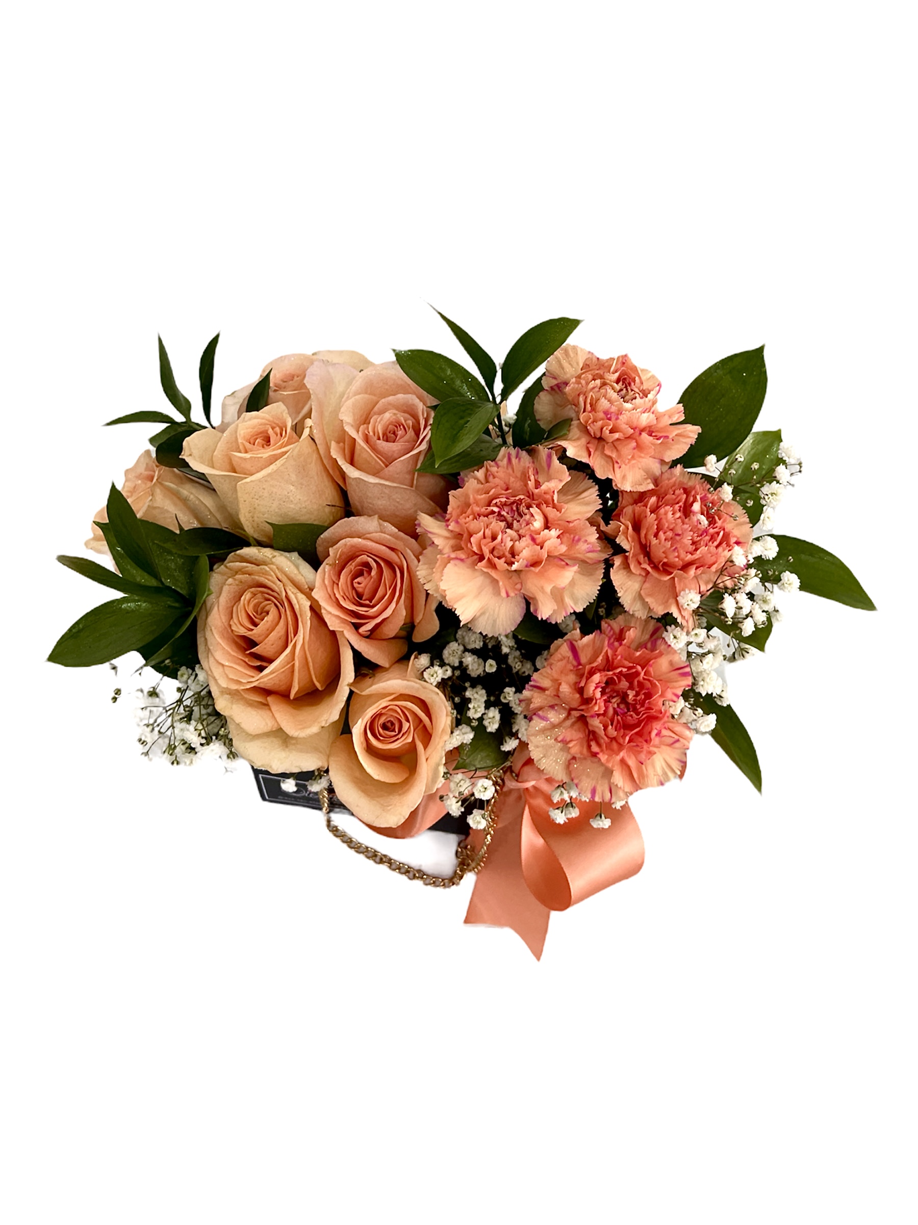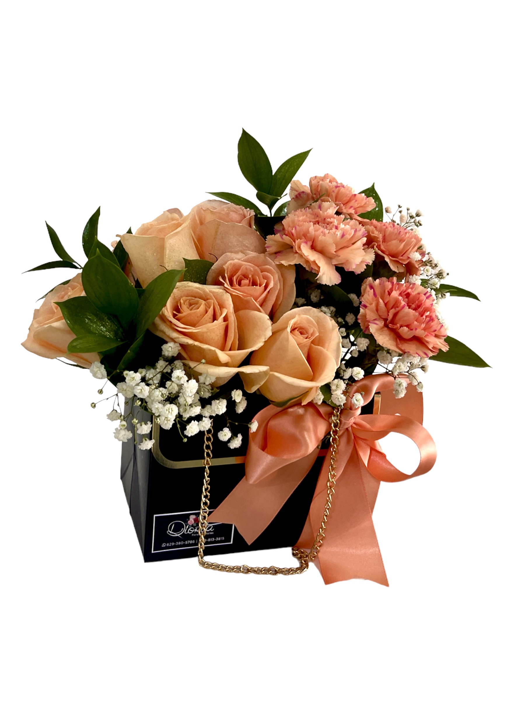 Caja forma cartera conservando 07 risas combinadas con gerberas y detalles de ruscus y baby breath. Lazo decorativo perfectamente combinado.