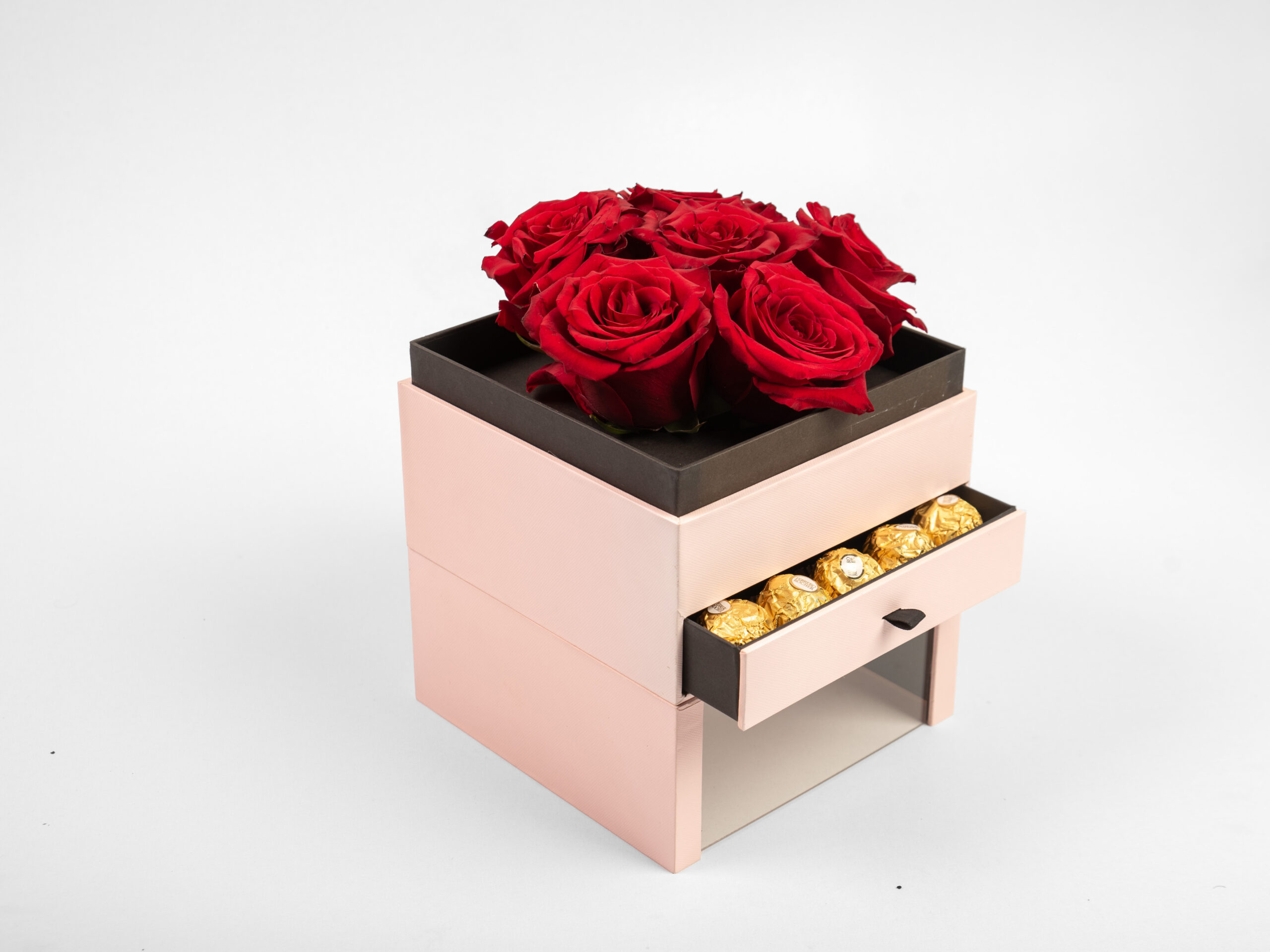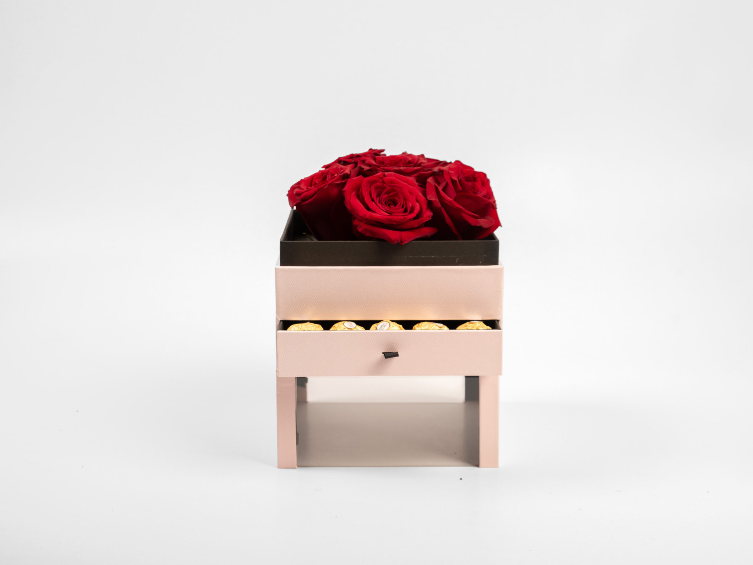 Caja cuadrada con tope clear surtida de 06 rosas y 20 bombones Ferrero Rocher.