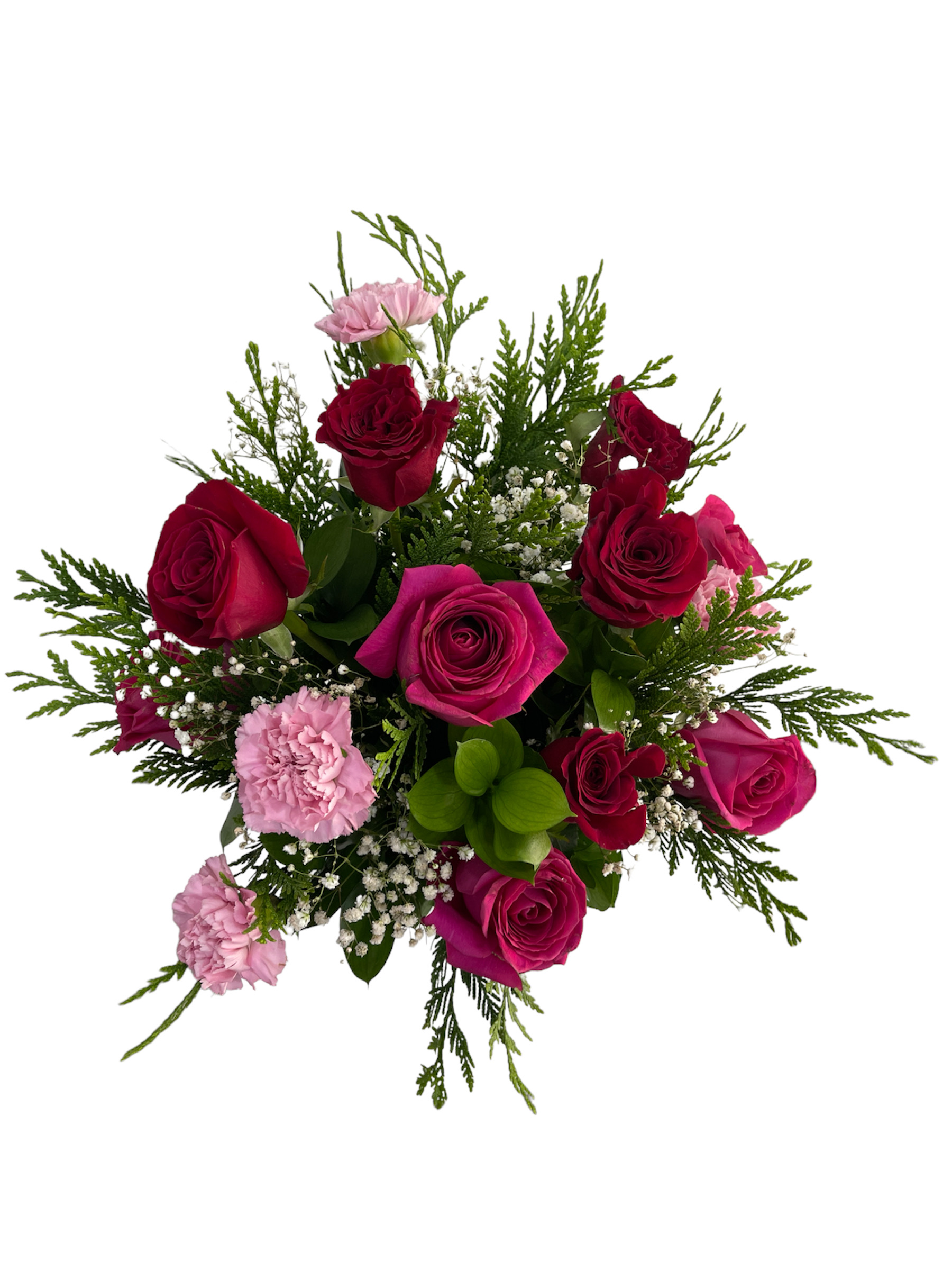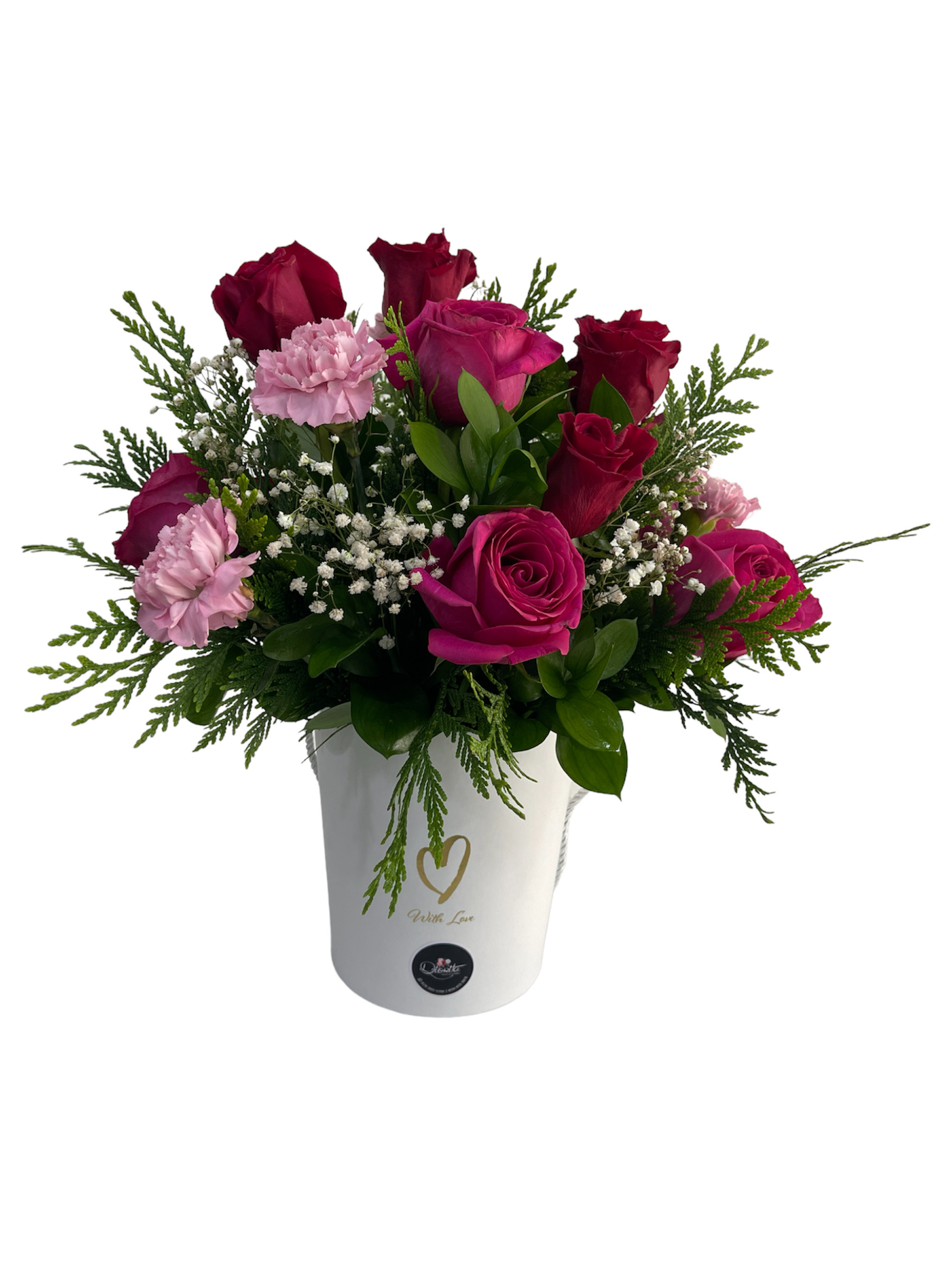 Caja forma florero surtida de 10 rosas y claveles con detalles de baby breath y relleno verde.