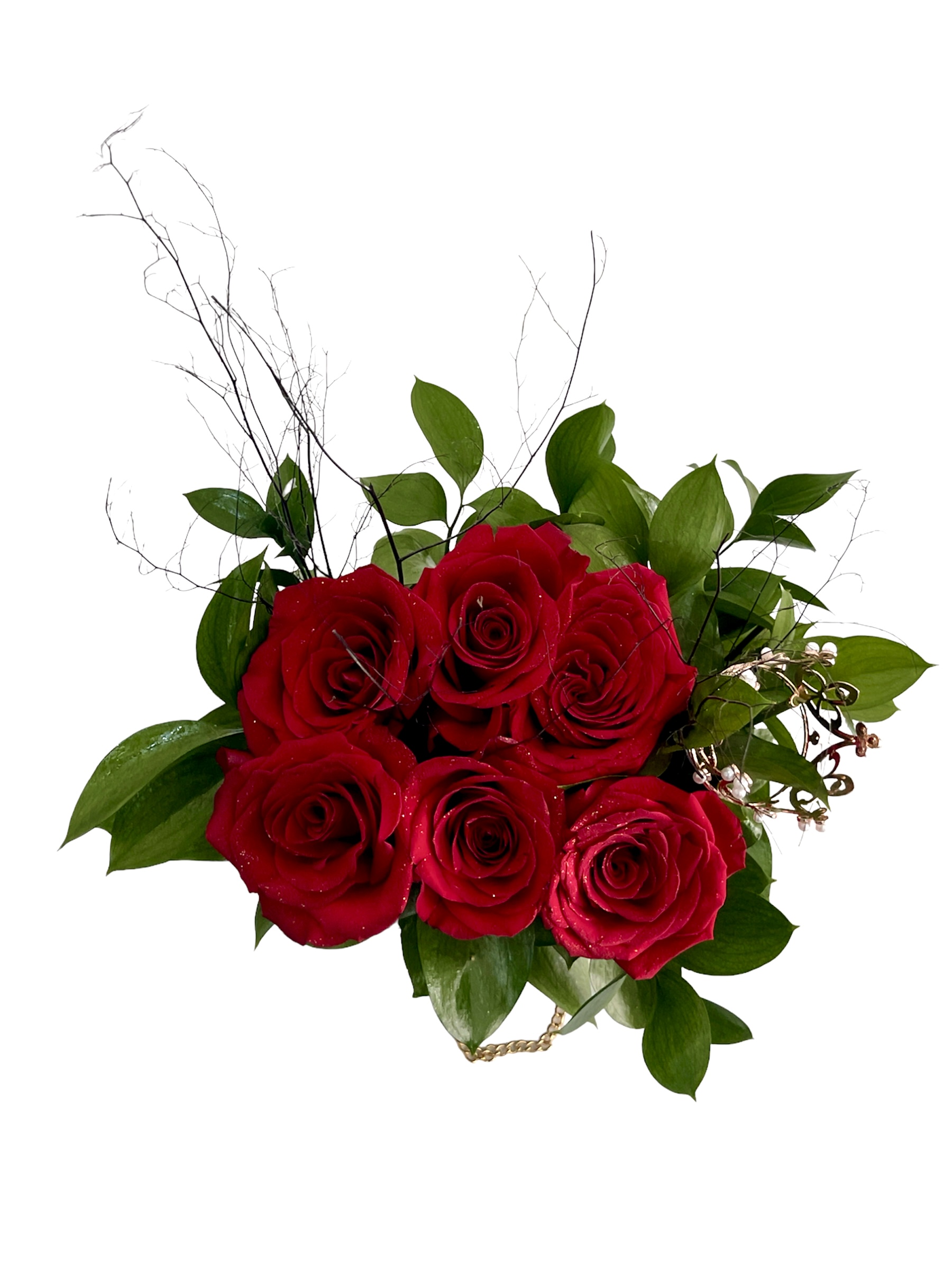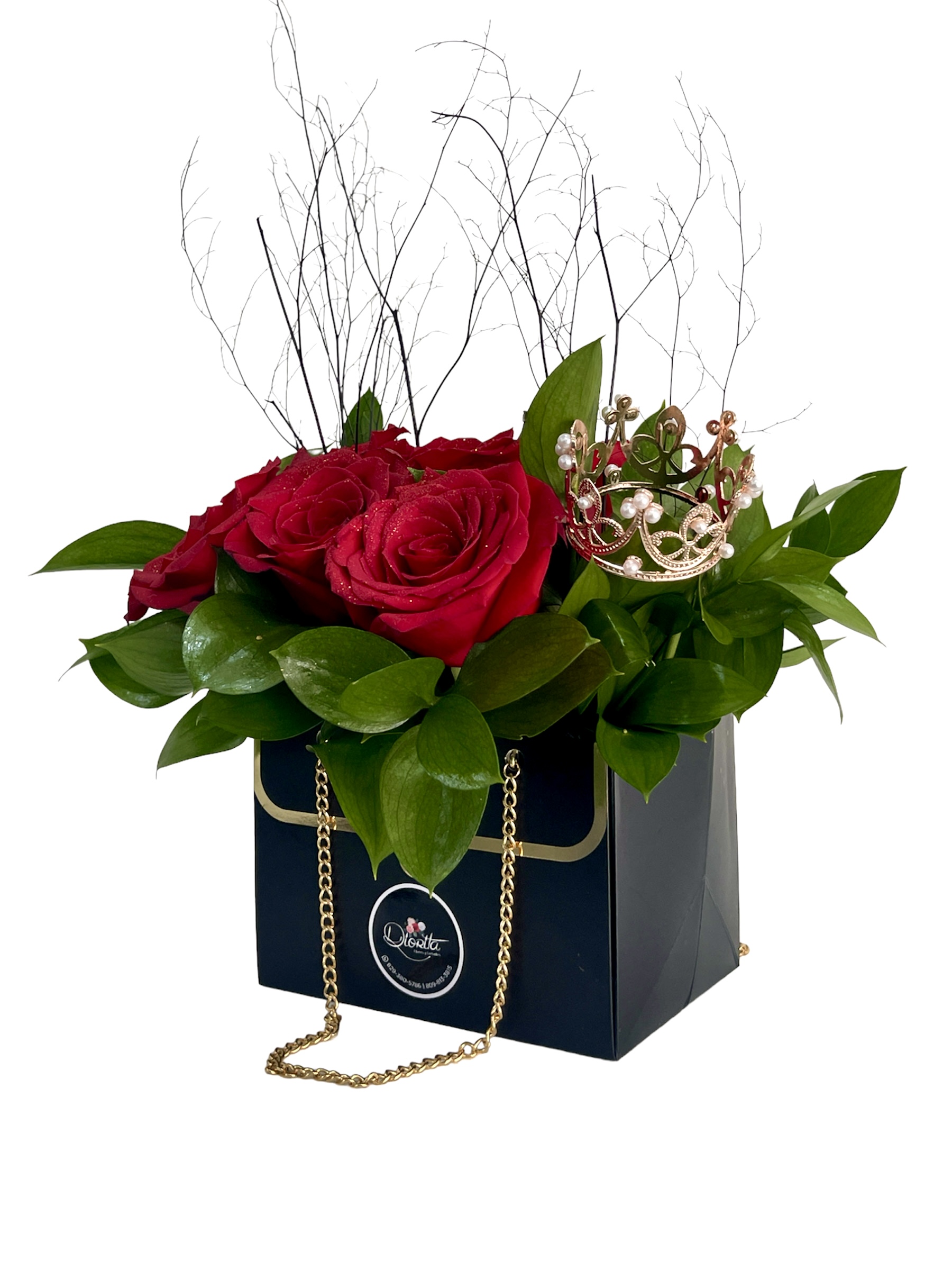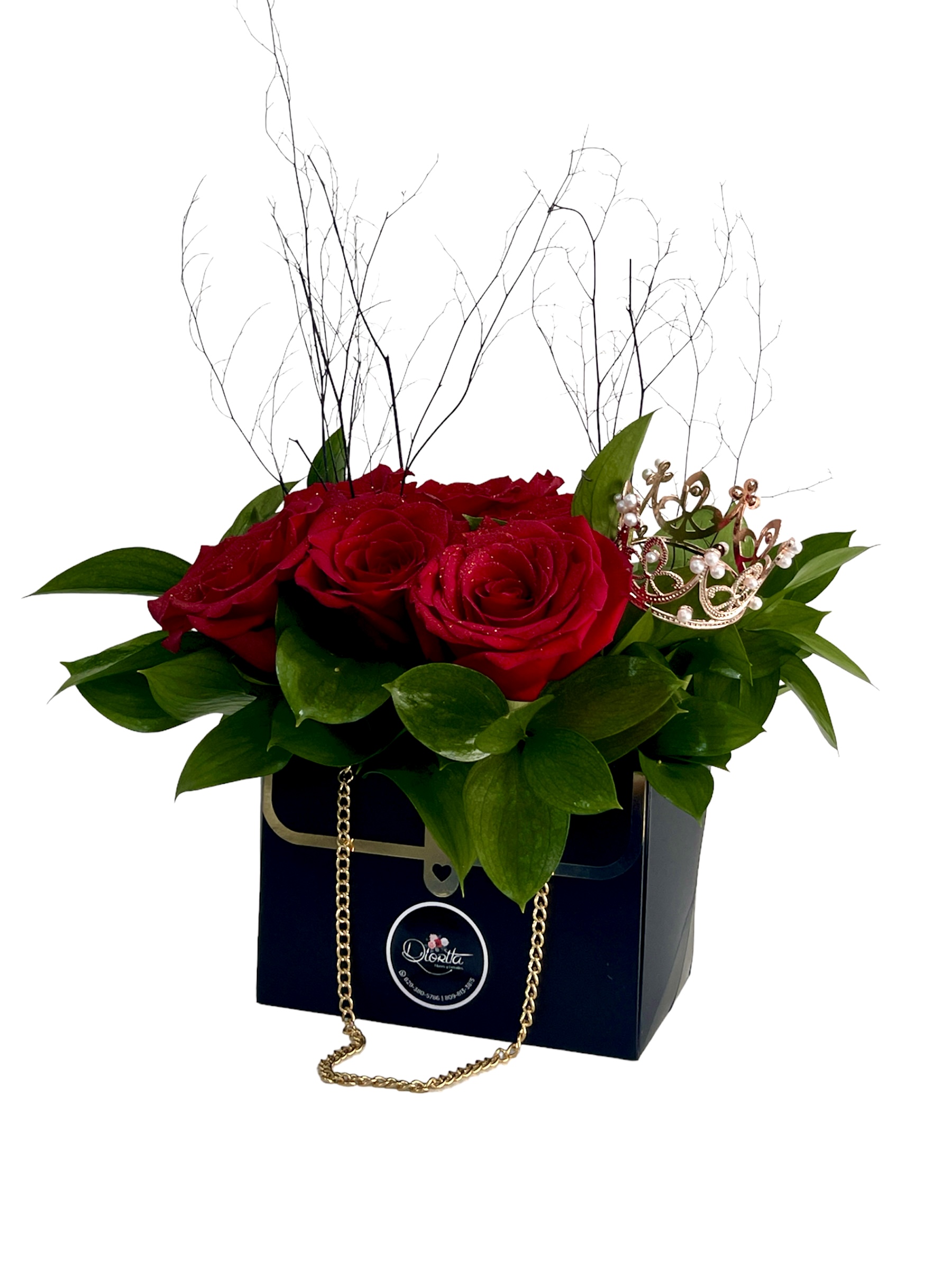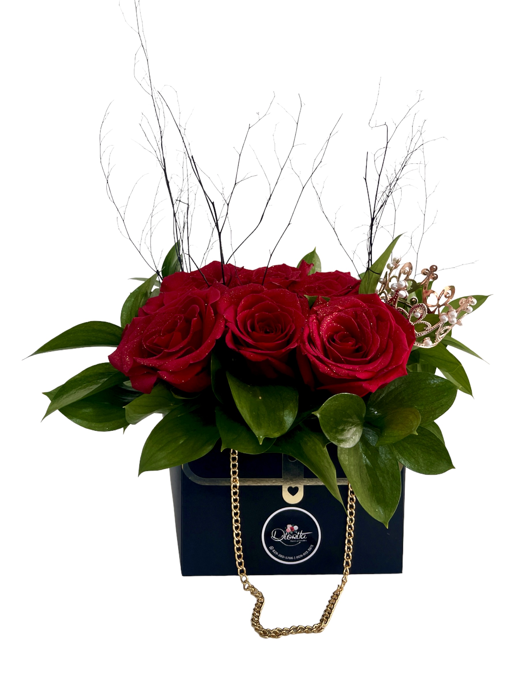 Caja forma cartera surtida de 06 rosas importadas y corona rose gold decorativa.