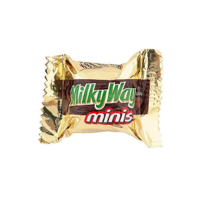 Porciones de chocolates minis en su variedad de marcas y componentes. Precio por unidad de porción.
