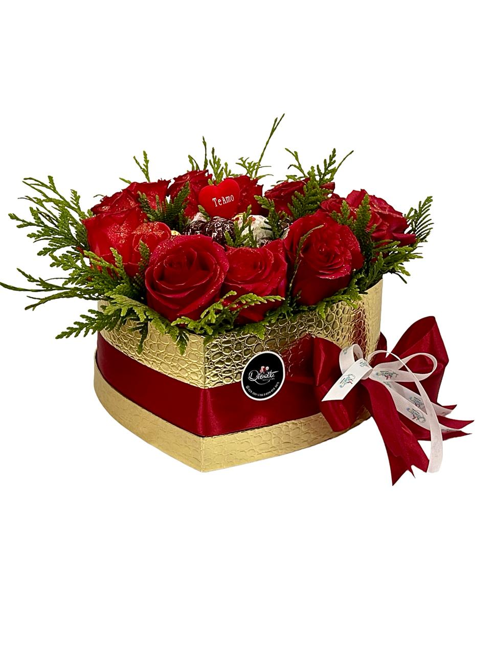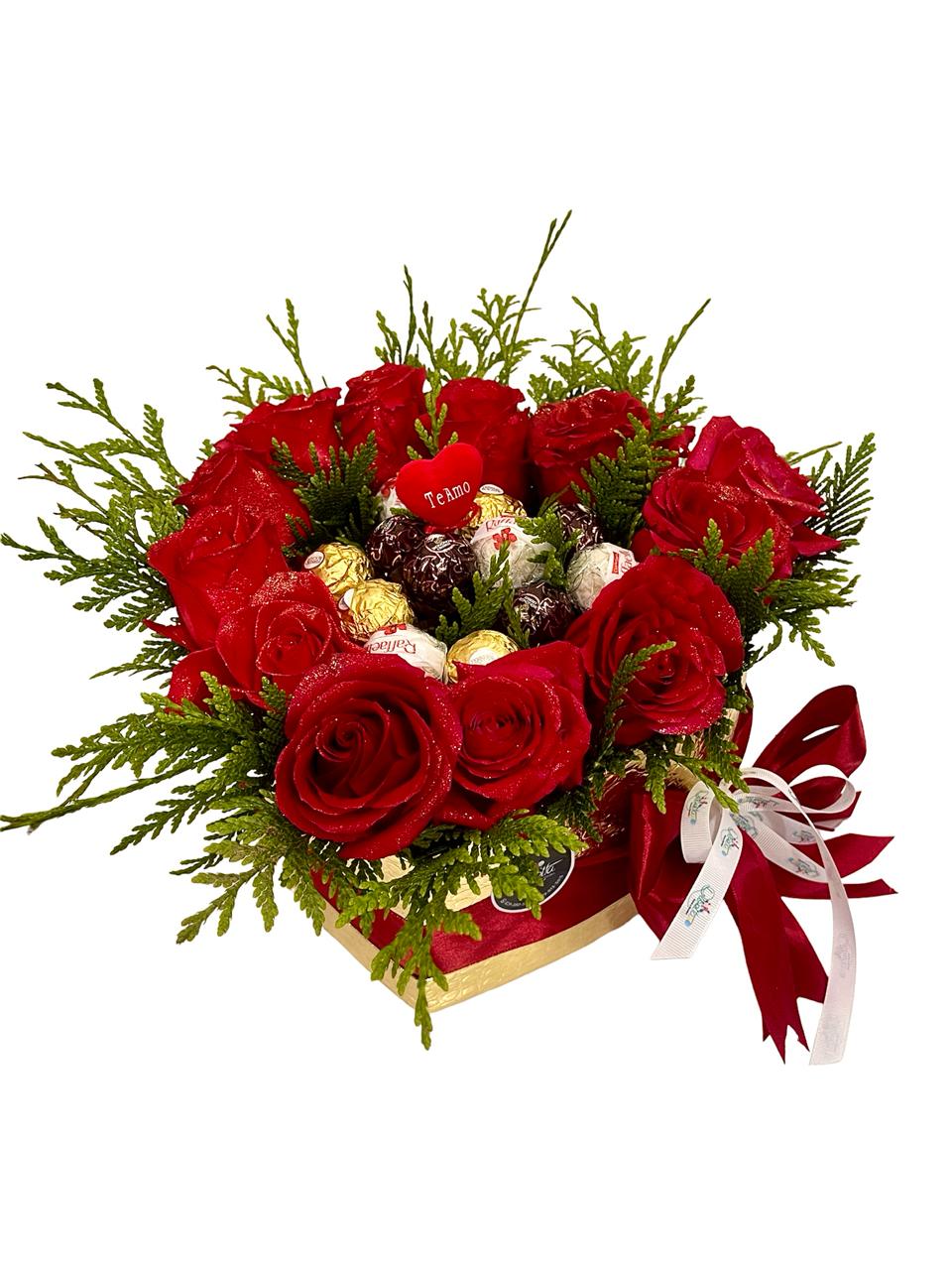 Caja forma corazón surtida de rosas importadas y bombones Ferrero Rocher.