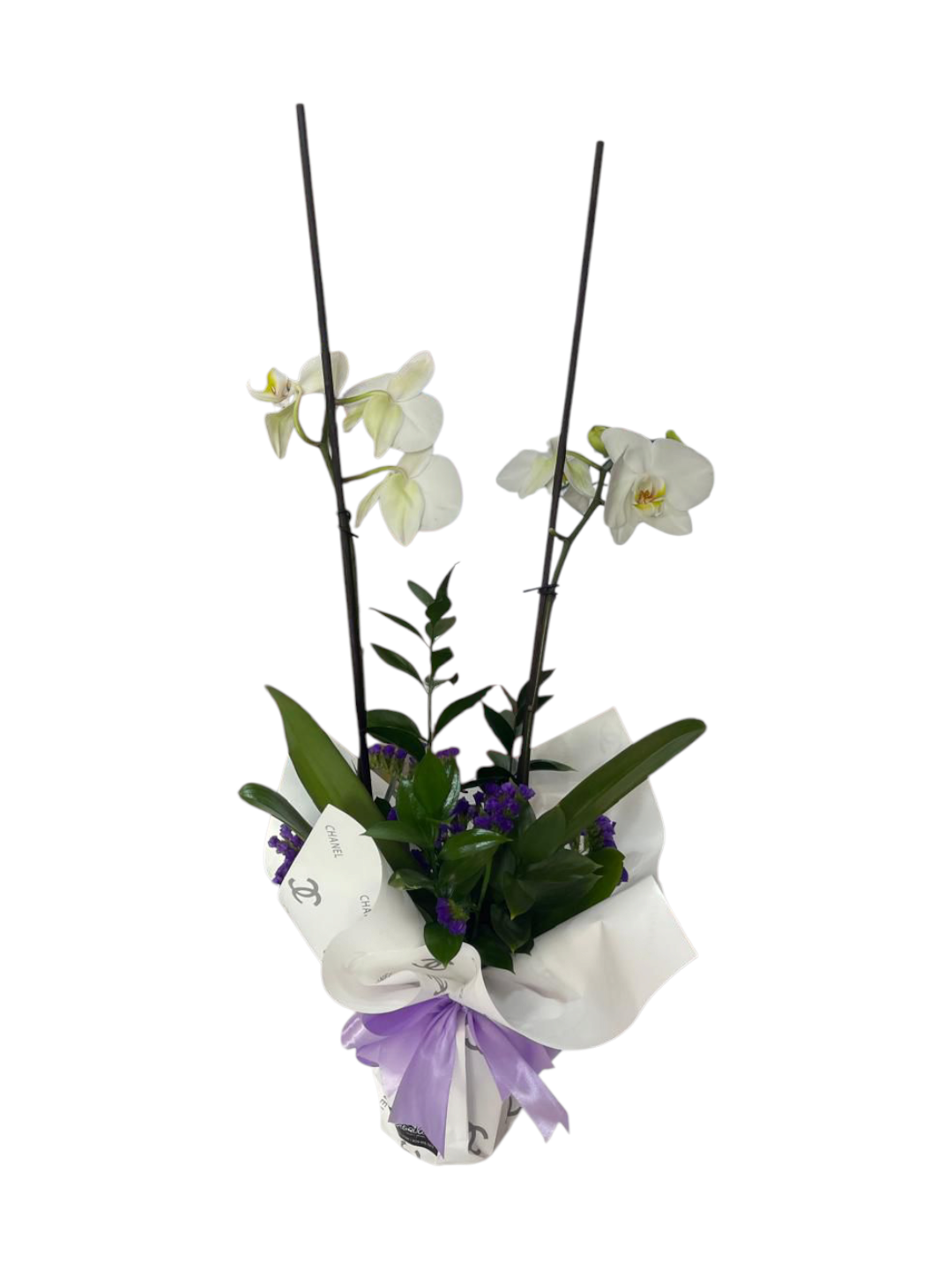 Dos majestuosos tallos de orquídea blanca combinados con ruscus y estatices morados, una fusión de elegancia y serenidad para regalar belleza en su máxima expresión.