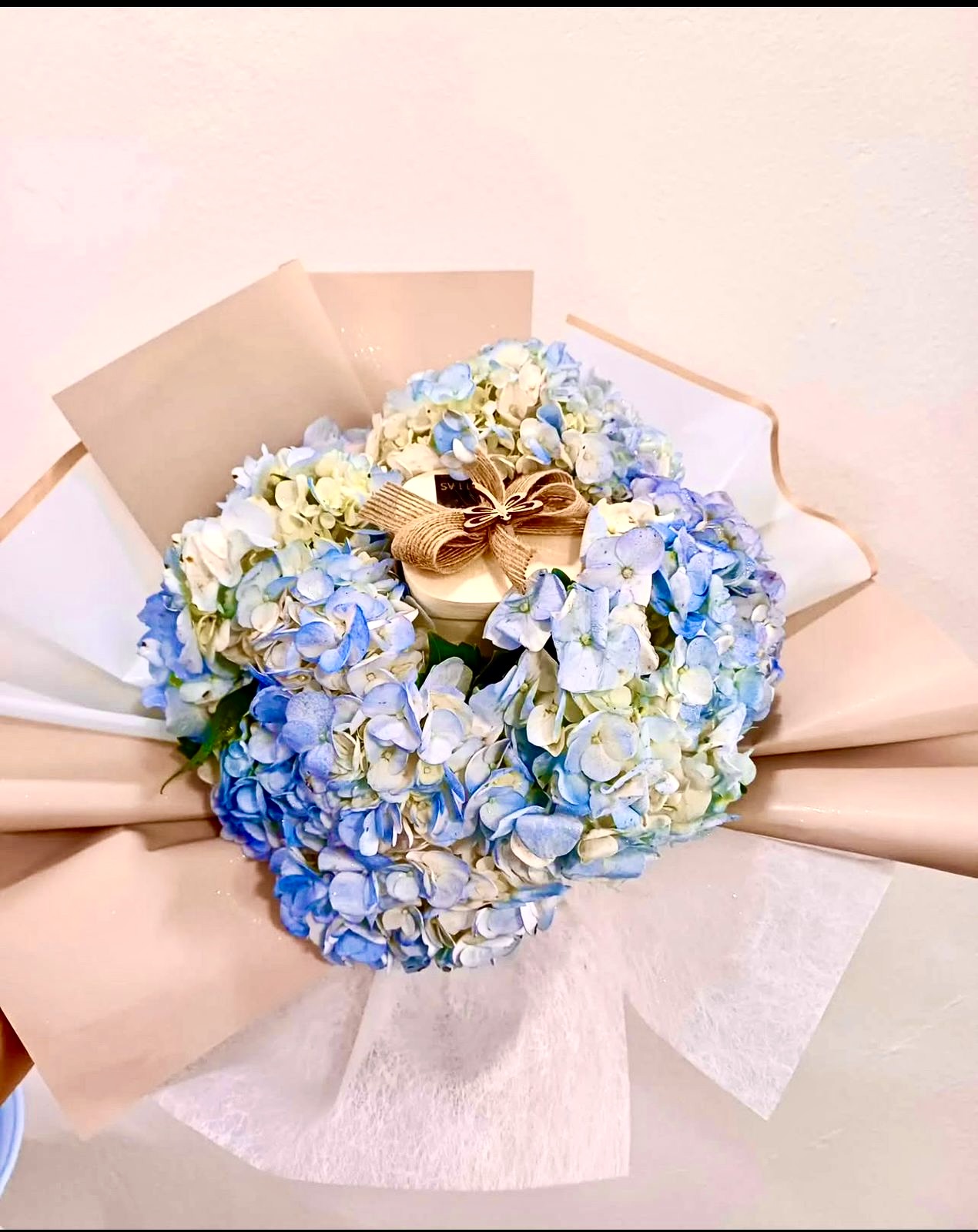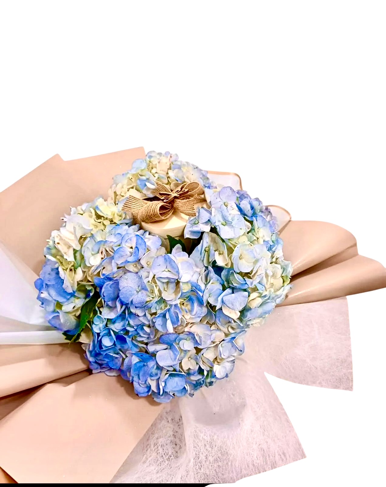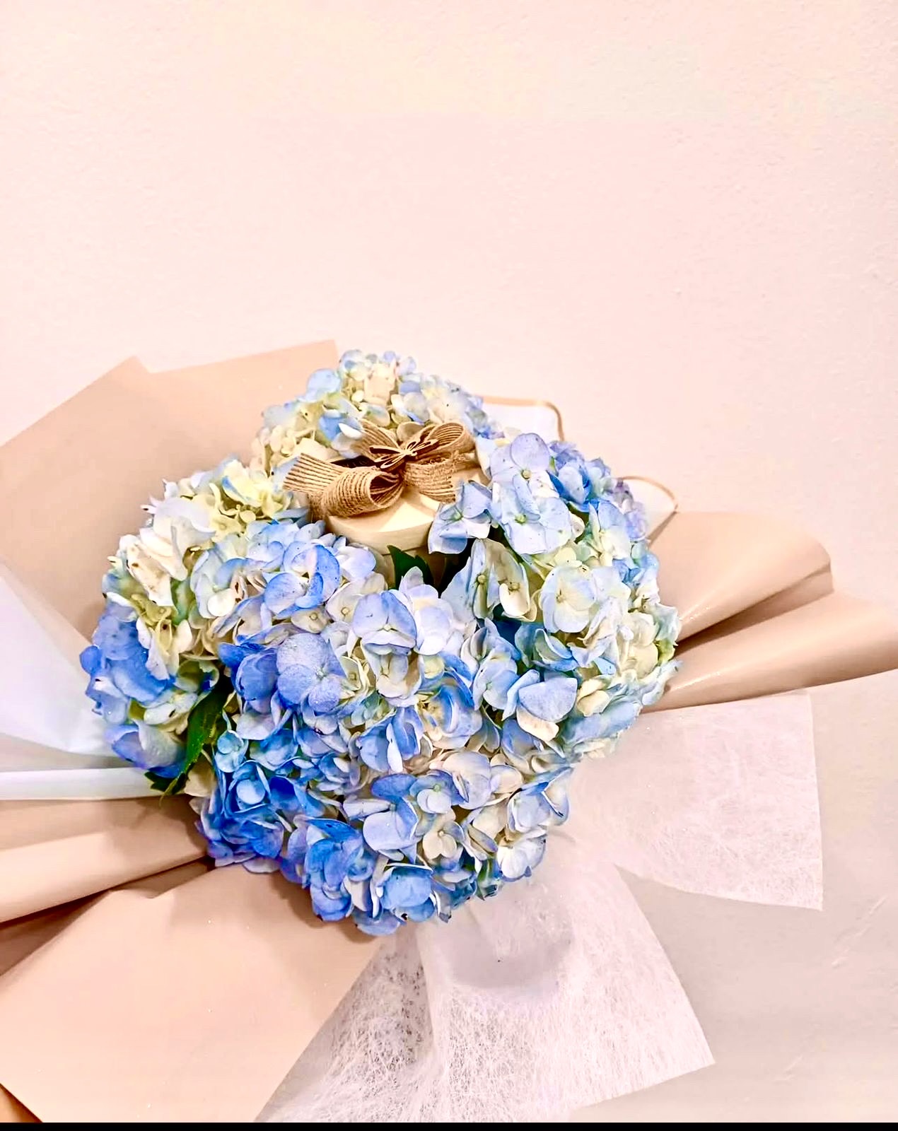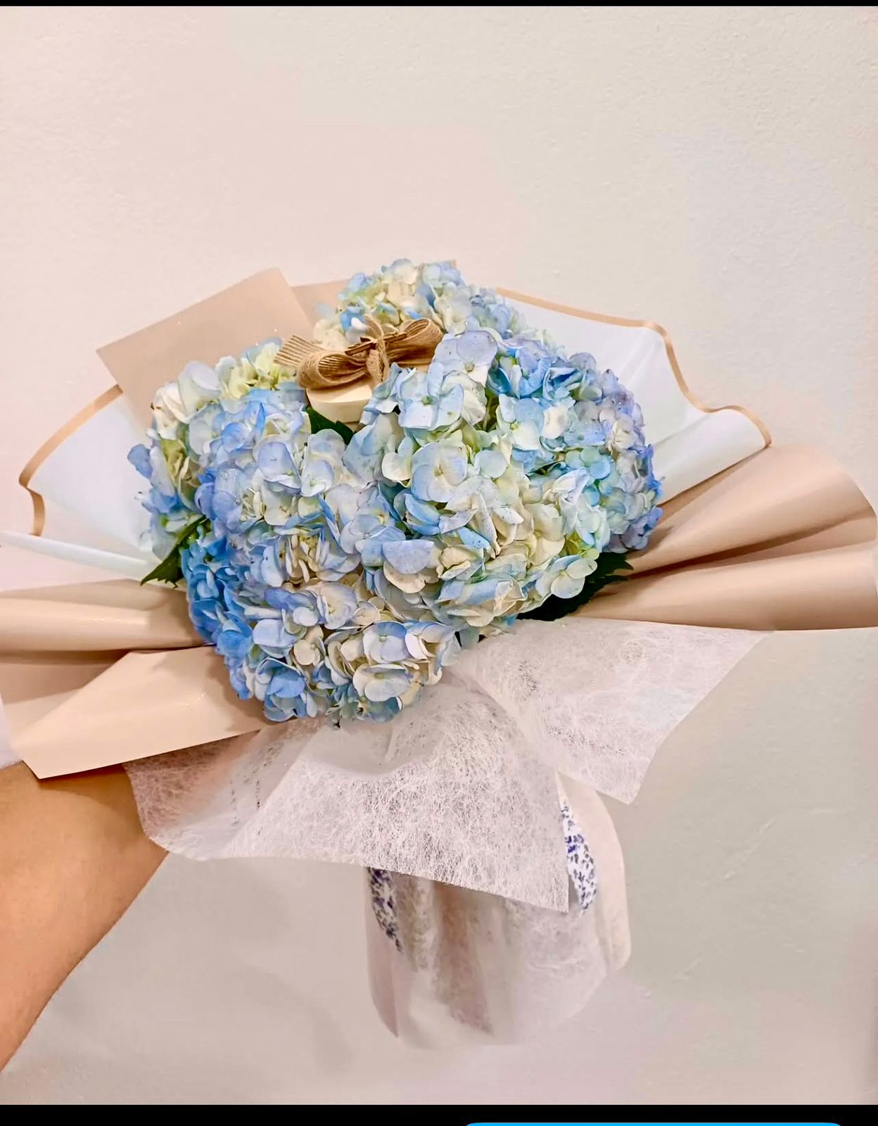 4 hortensias azuladas en fina envoltura papel Kraft combinado con malla blanca y lazo fabuloso.