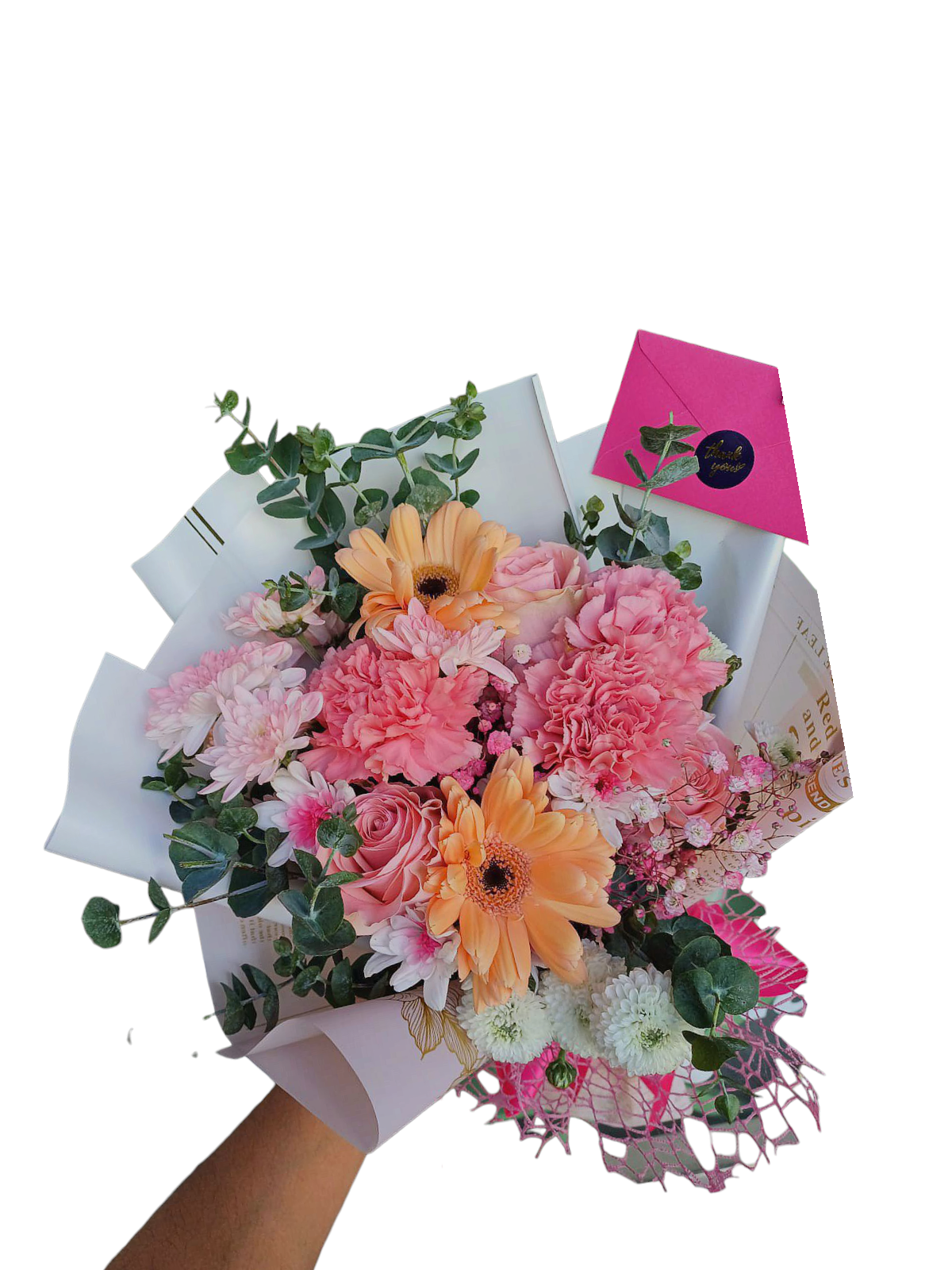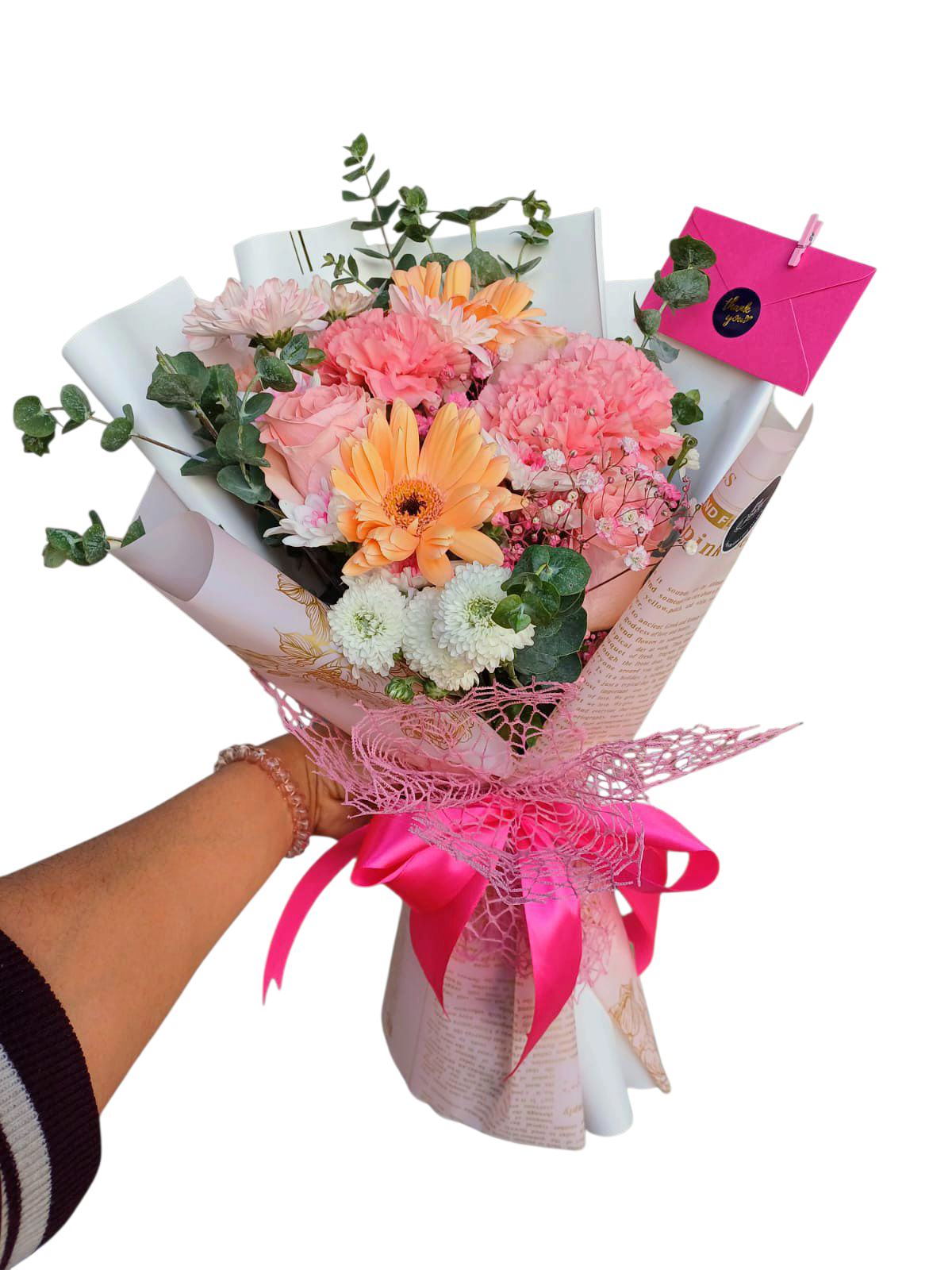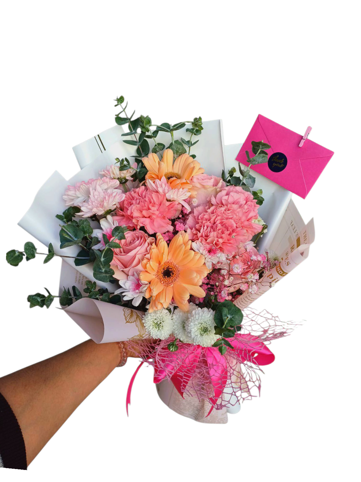 Un bouquet exuberante que celebra la belleza natural: eucalipto fragante, baby breath delicado y flores que despiertan los sentidos. Puro encanto floral.