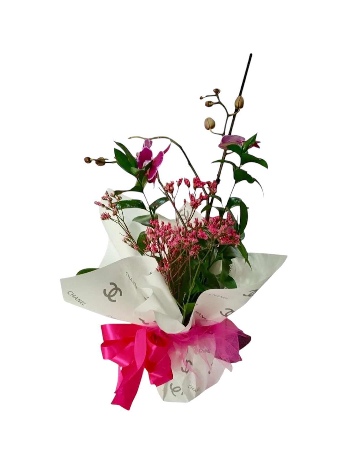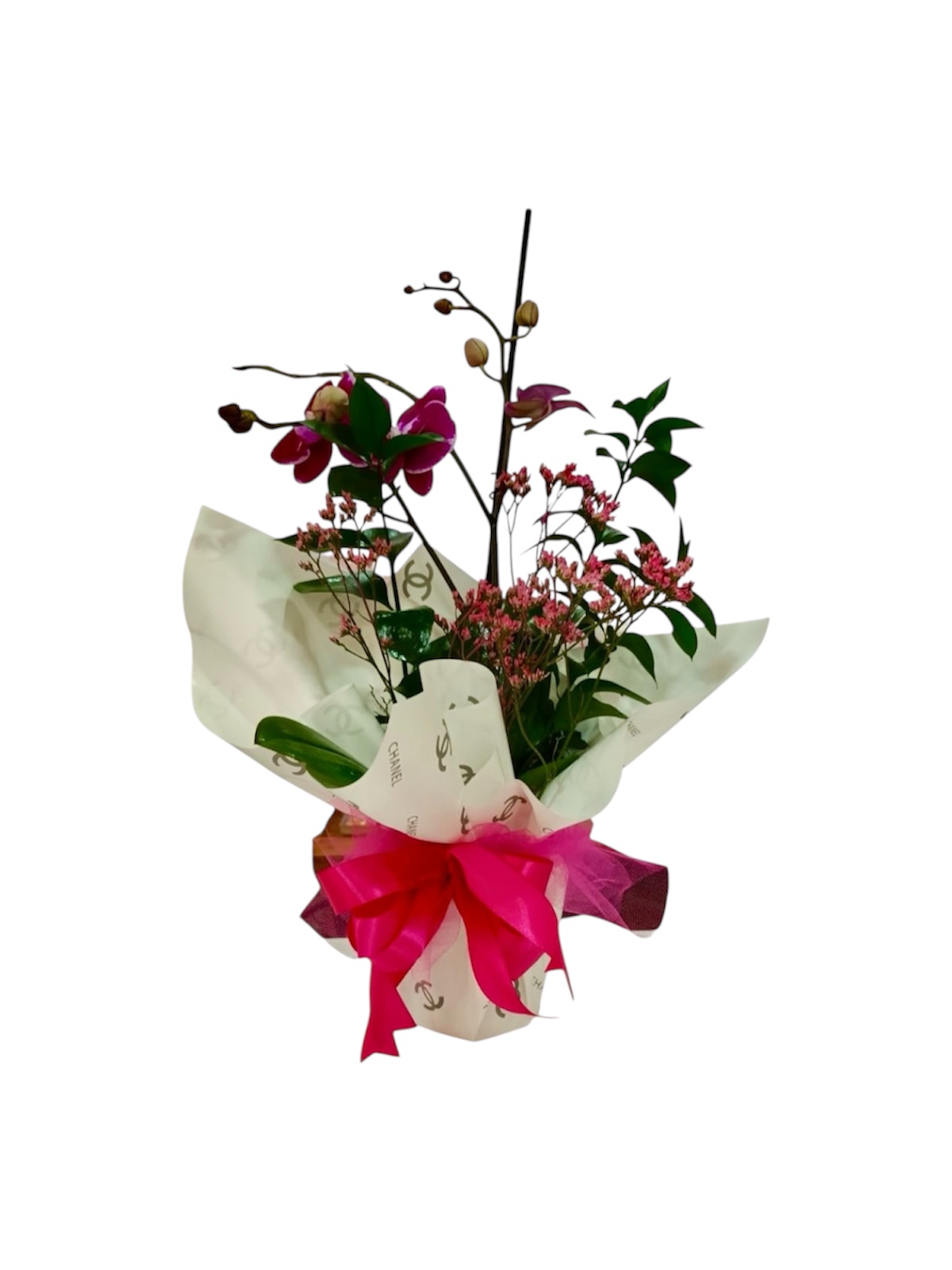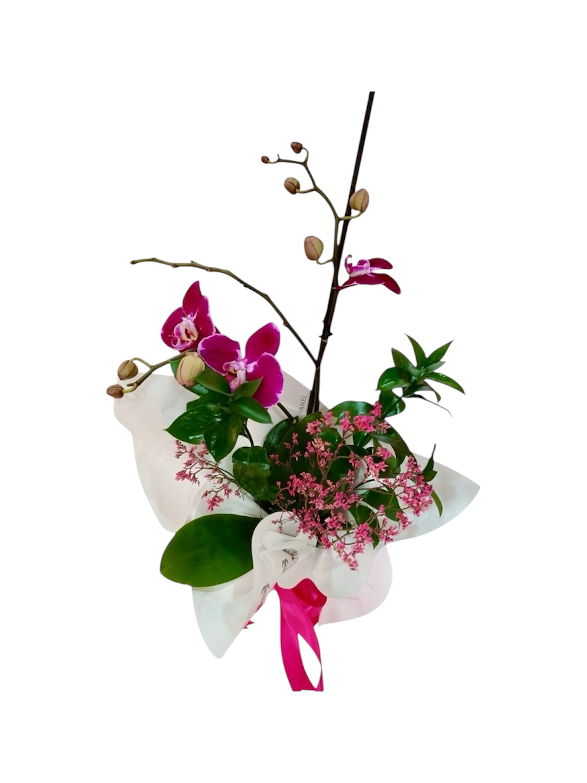 Orquídea fucsia con flores rosadas, envuelta con papel de diseño y lazo vibrante. Un detalle chic y sofisticado, ideal para impresionar.