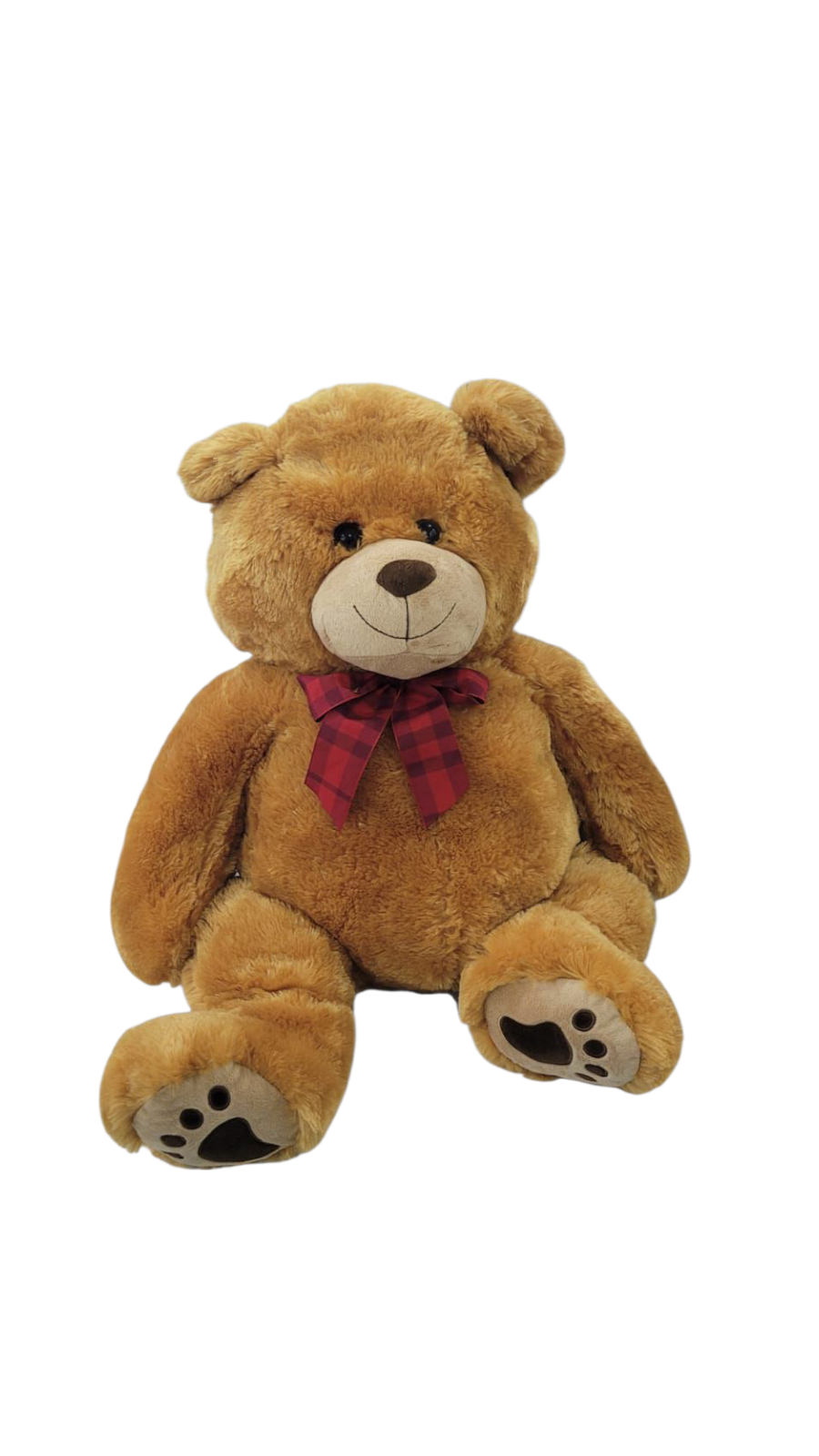 Peluche osito marrón sentado con corbatín rojo.