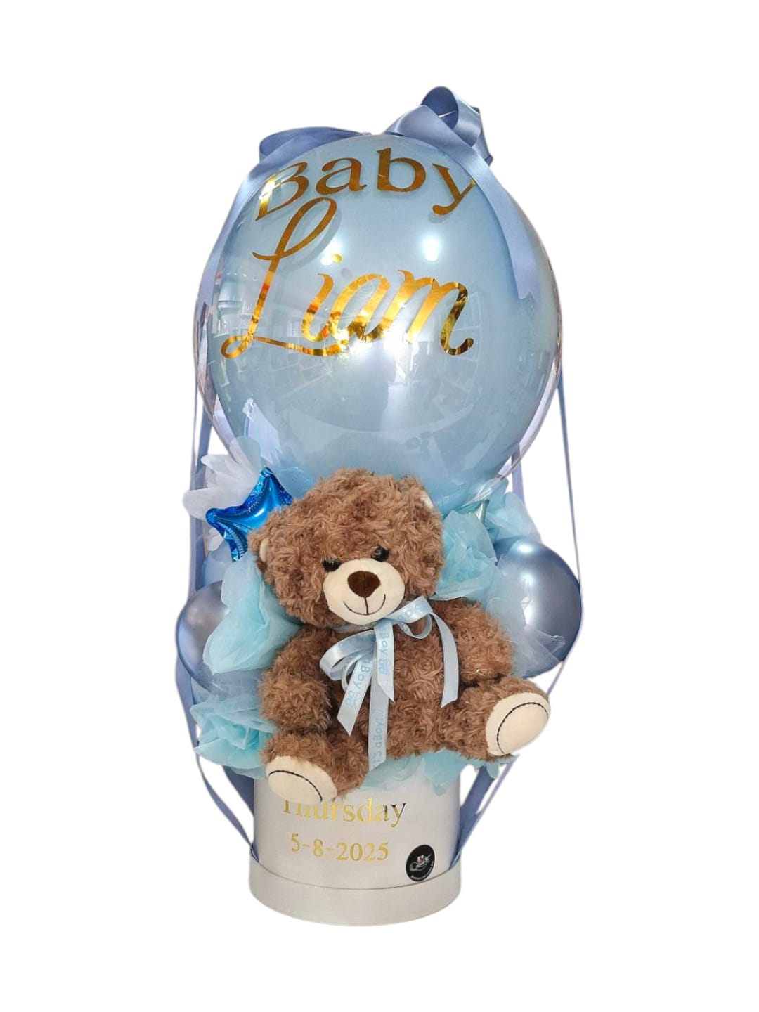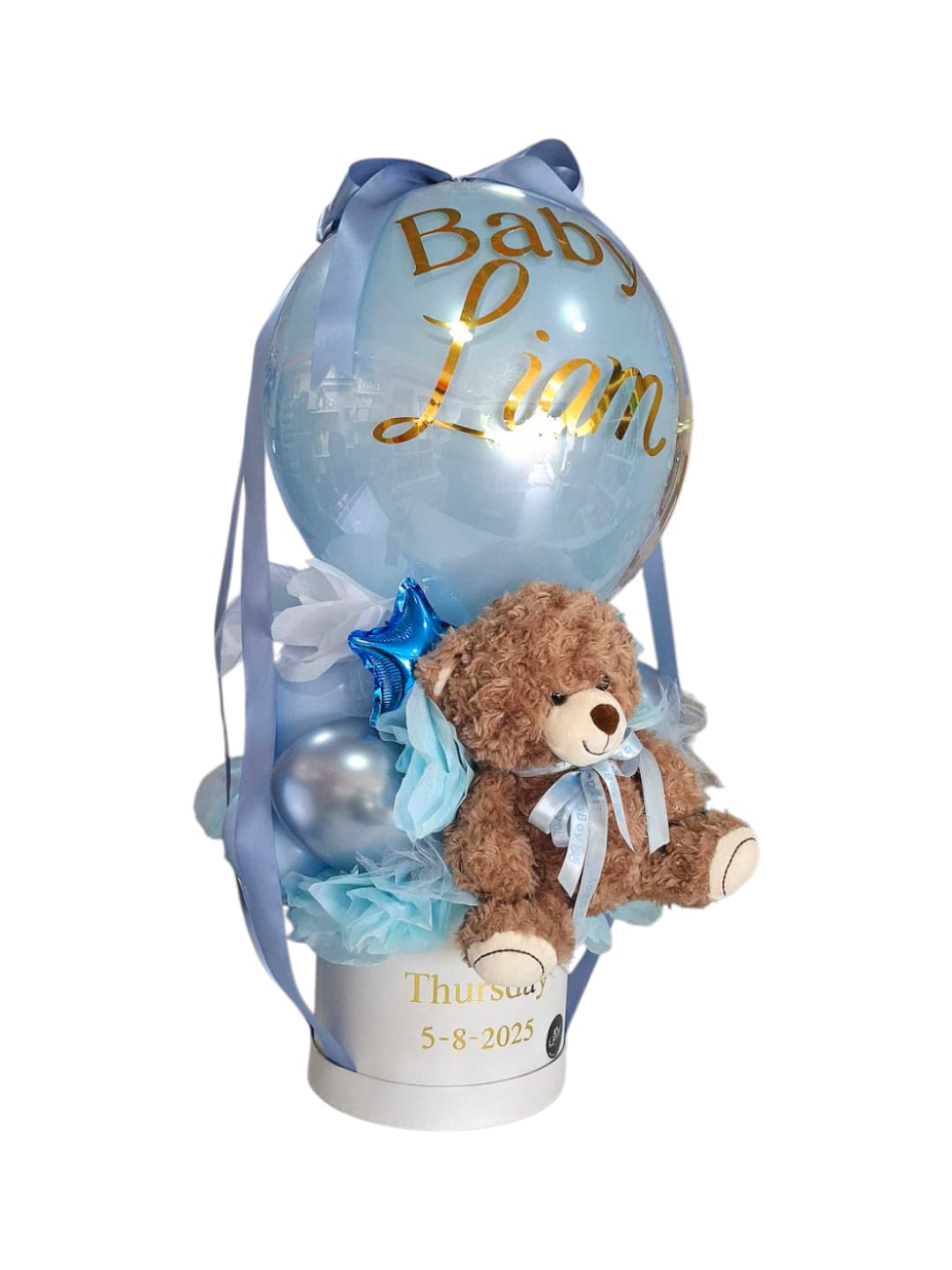 Incluye globos de látex, base redonda de cartón personalizada, un tierno oso de peluche, globo personalizado y una estrella mini decorativa. Perfecto para sorprender con ternura, color y un toque especial.