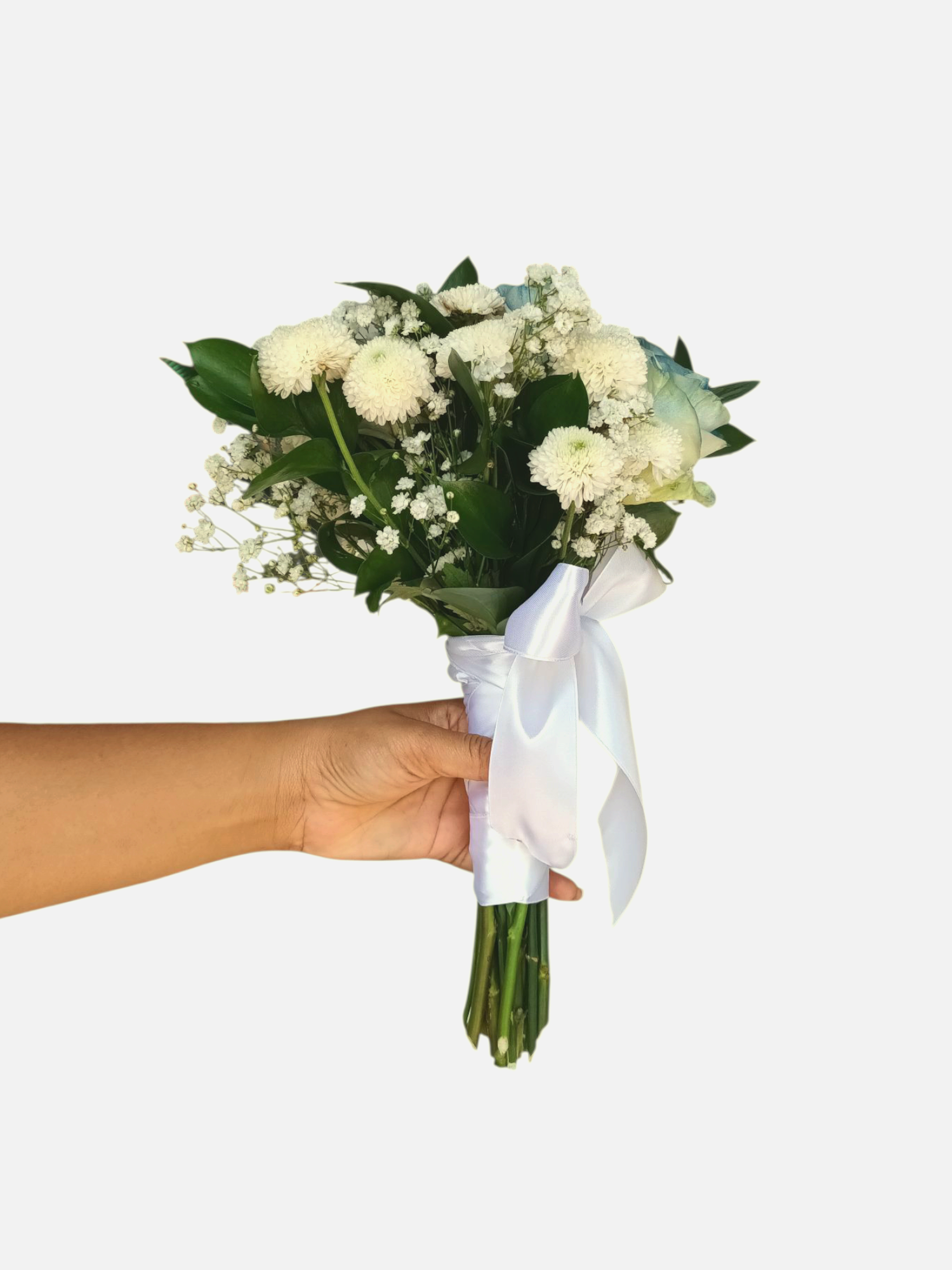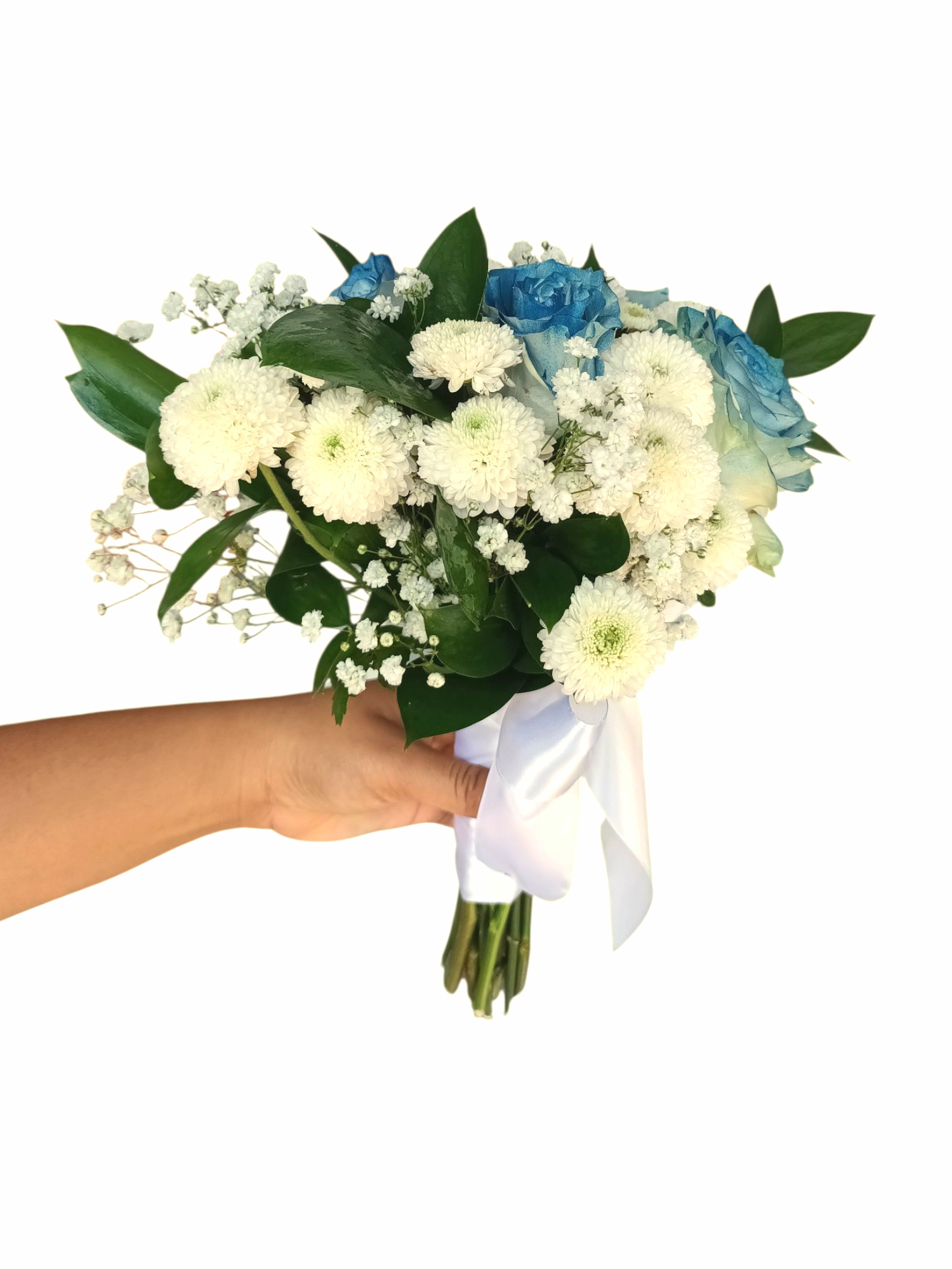 Rosas azules y flores blancas en un delicado ramo de mano, atado con cinta blanca. Perfecto para novias, bautizos o momentos llenos de pureza y elegancia.