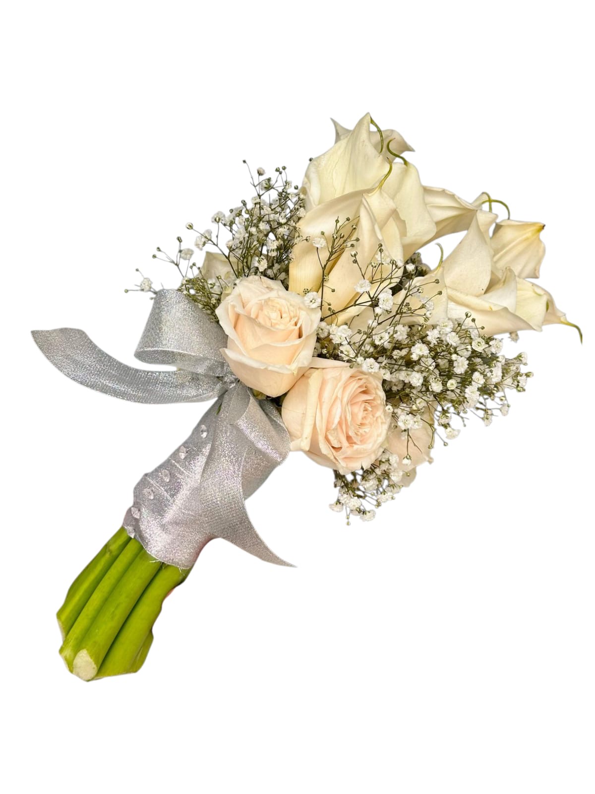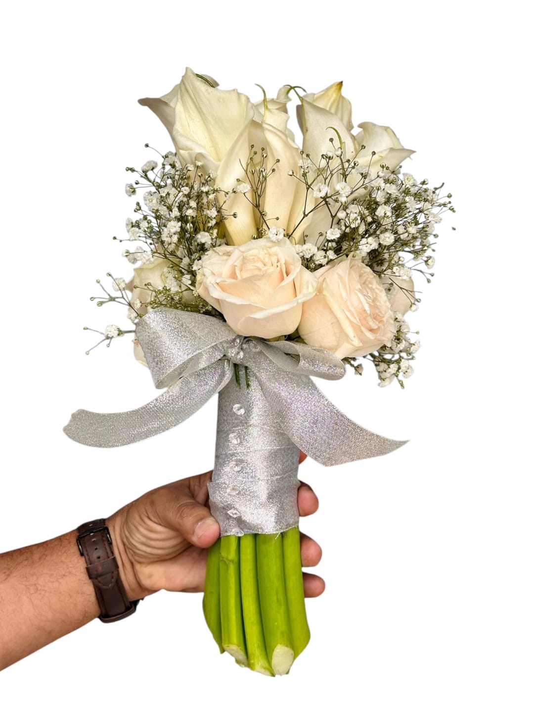 Ramo compuesto por 08 rosas blancas, baby breath y ruscus.