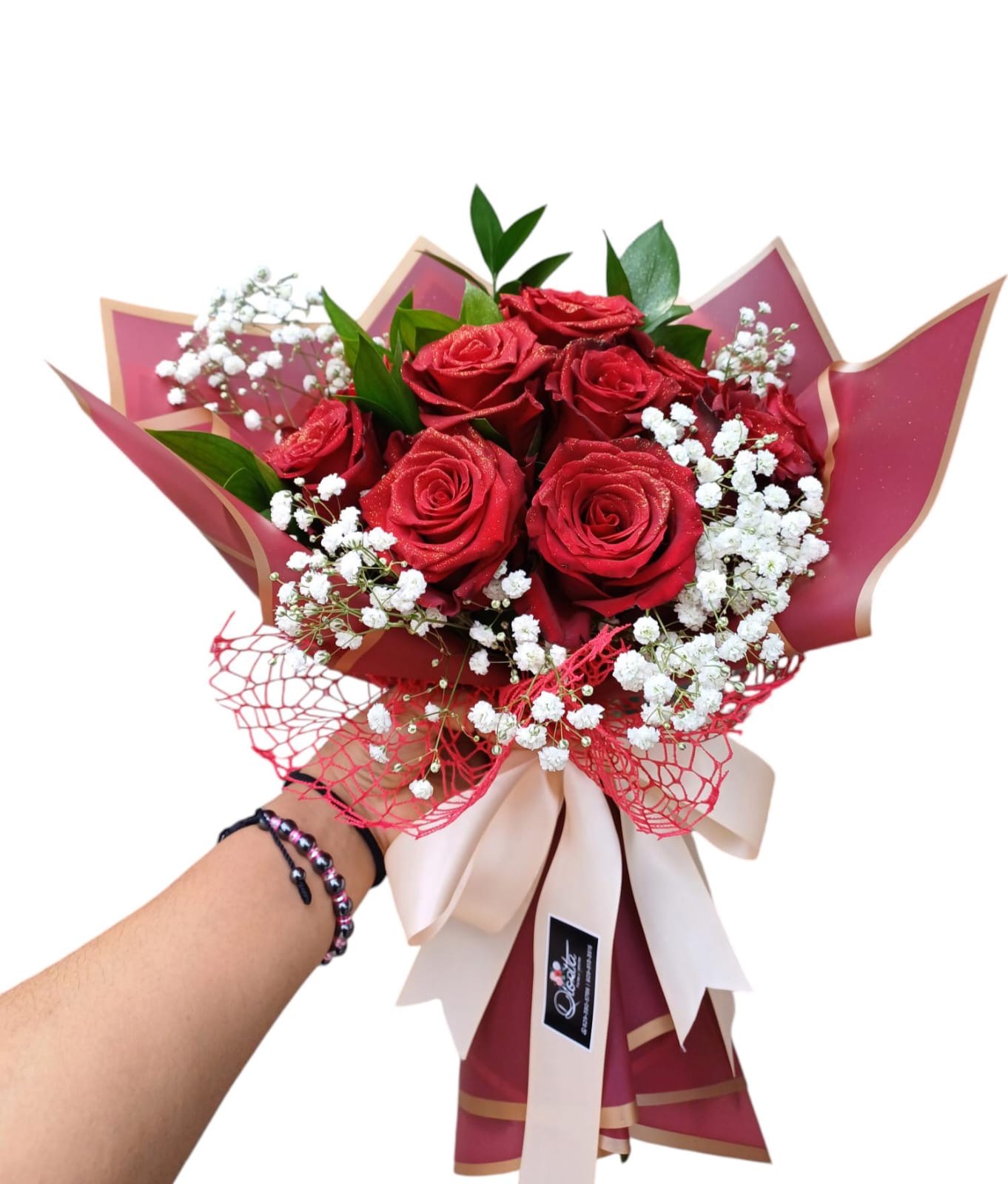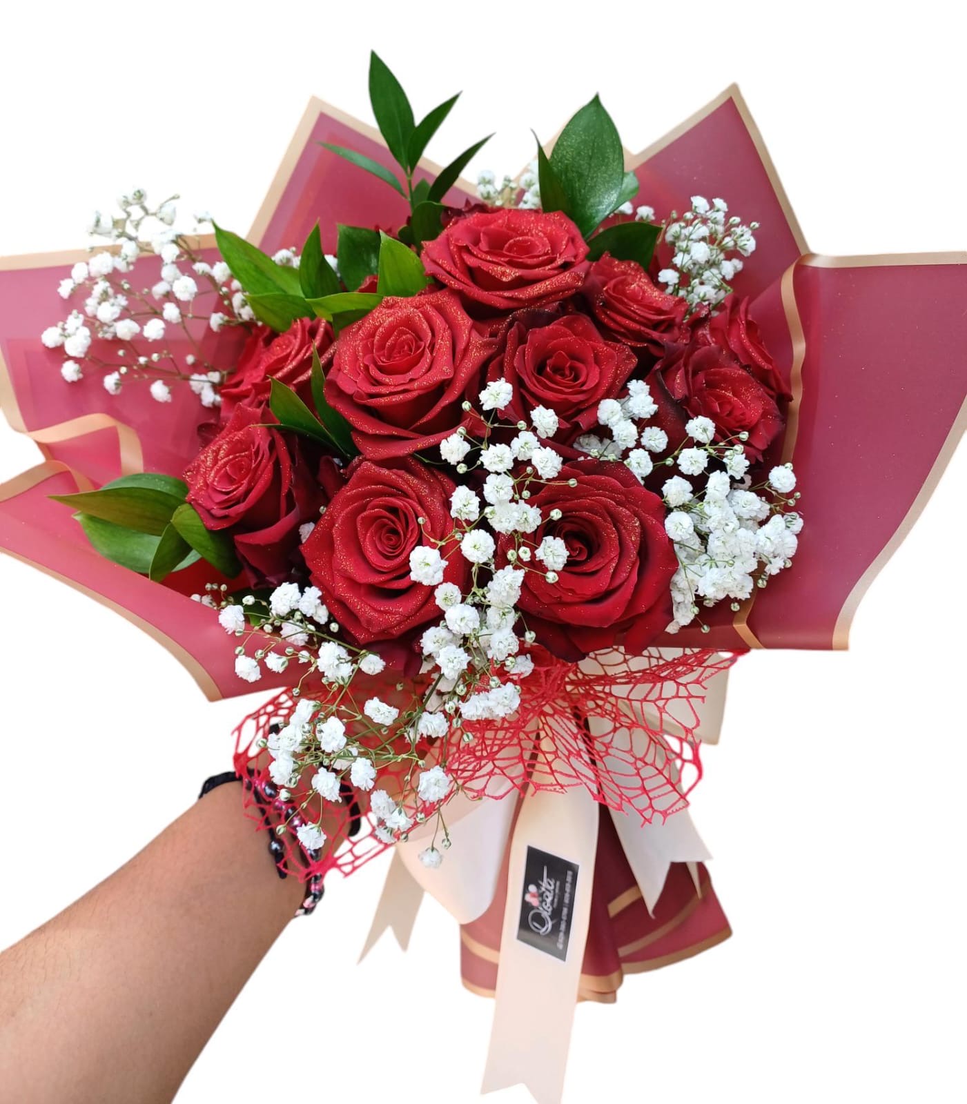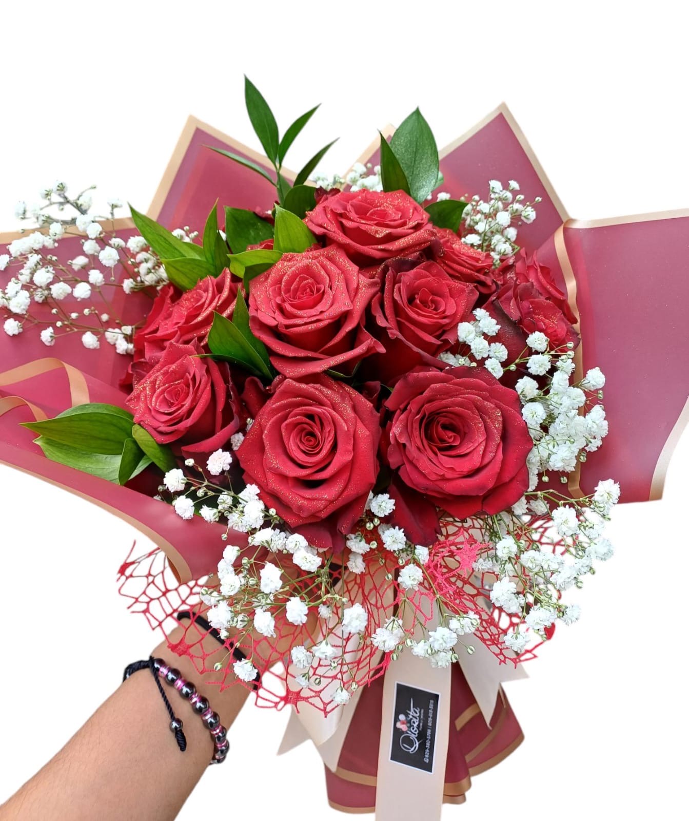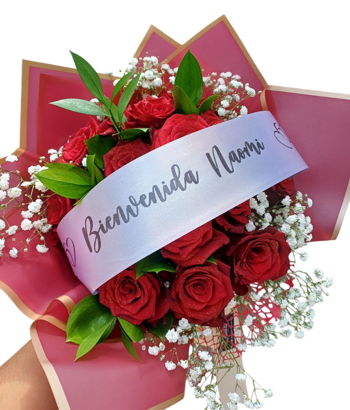 Bouquet de 14 rosas rojas bordeadas de ruscus y baby breath, con envoltura en papel borde dorado y lazo decorativo. Cinta personalizable en el tope de las rosas.