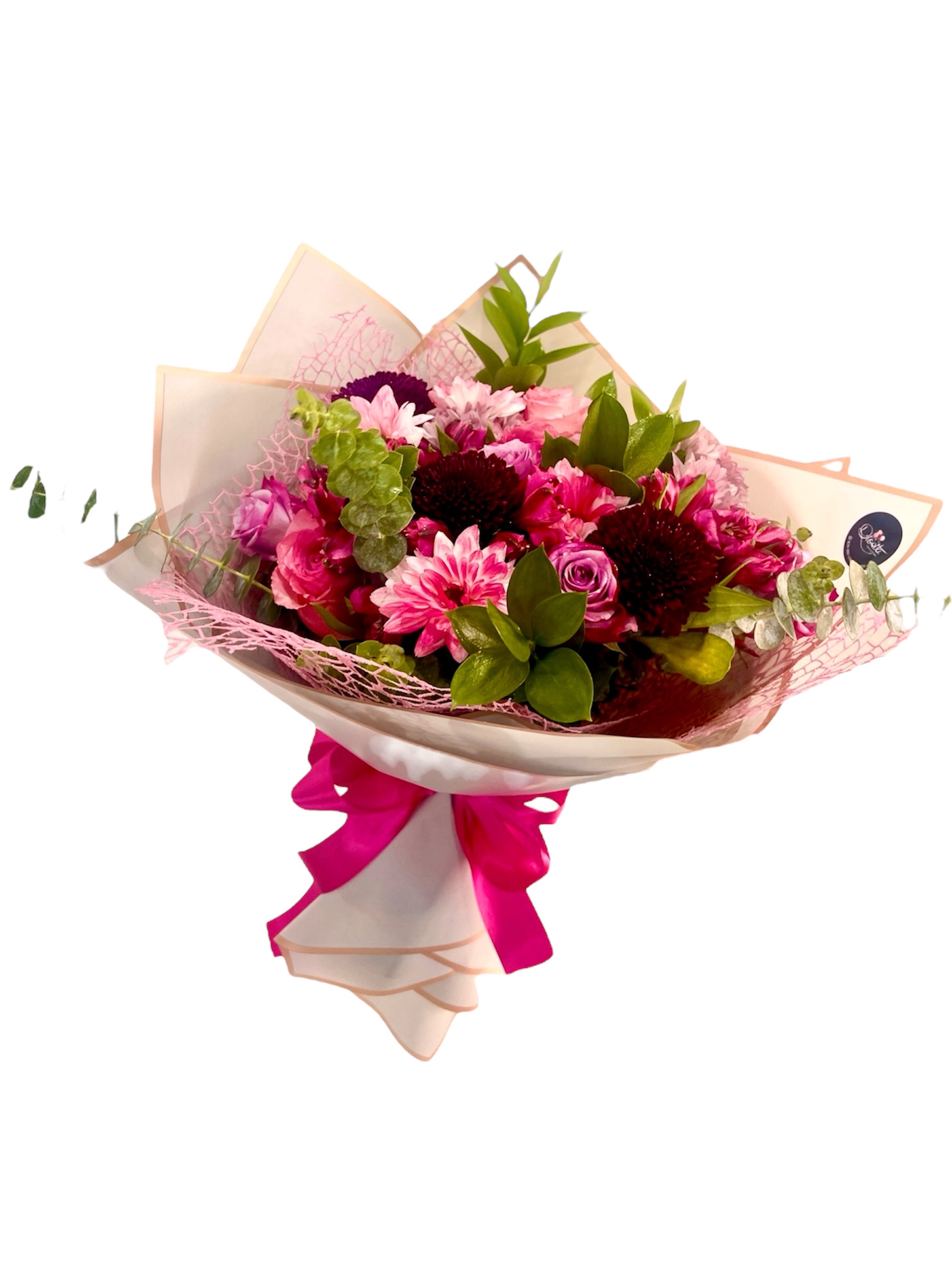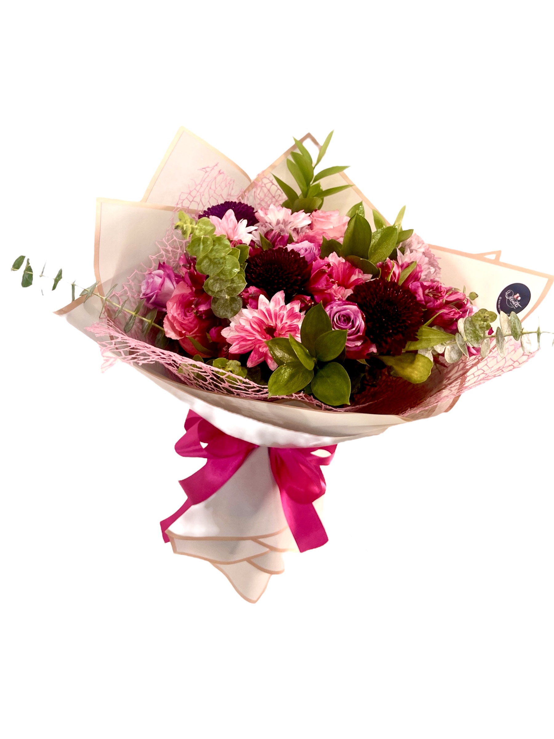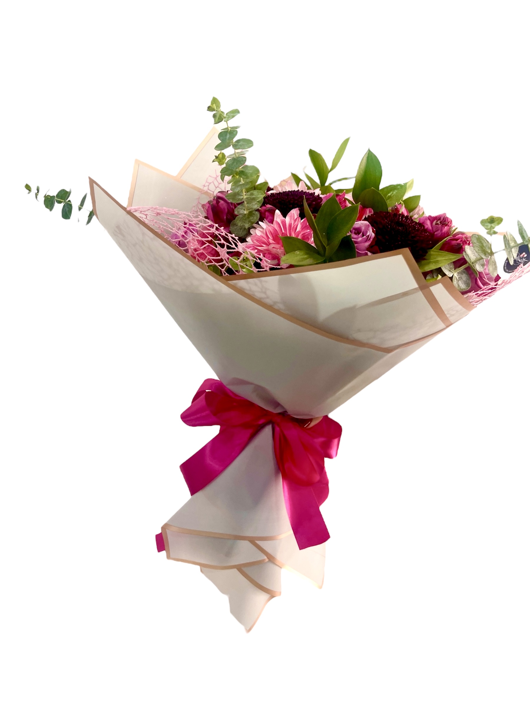 Bouquet compuesto por rosas, pompones, crisantemos y astromelias; con detalles de eucalipto y ruscus.
