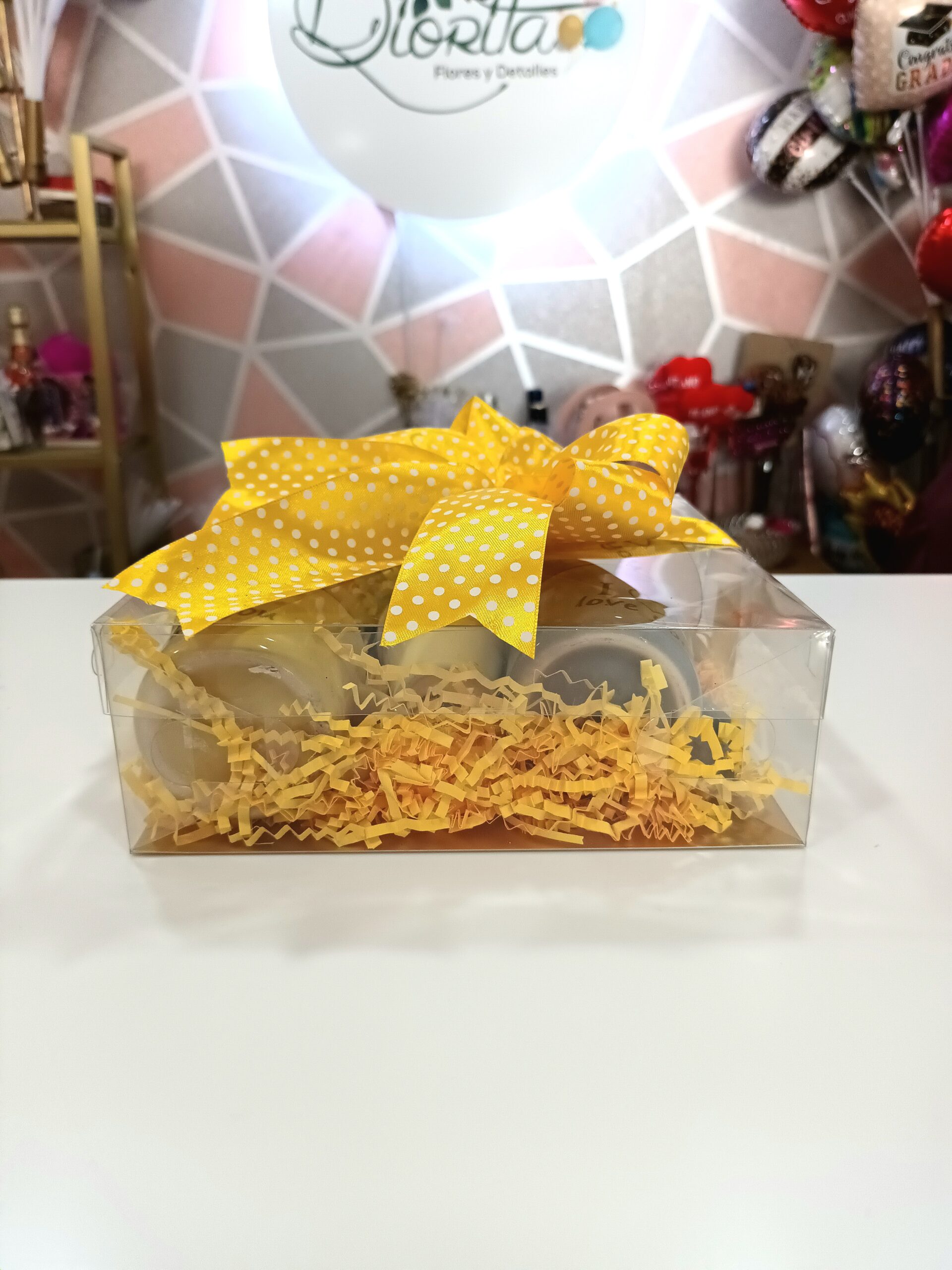 Set de 4 tacitas ‘I Love You’, florerito decorativo en caja clear con envoltura y lazo elegante. ¡Perfecto para decir te amo con estilo!