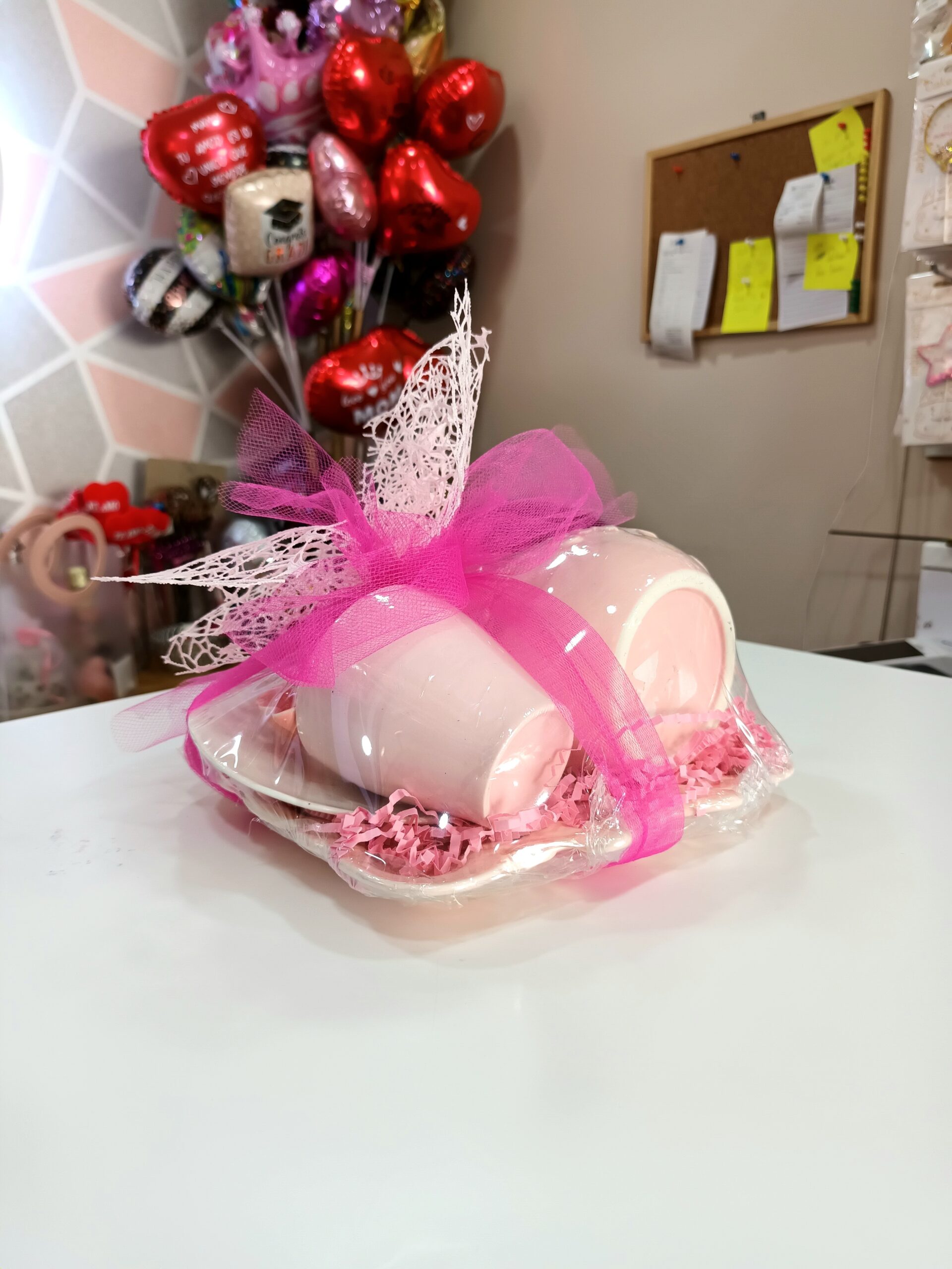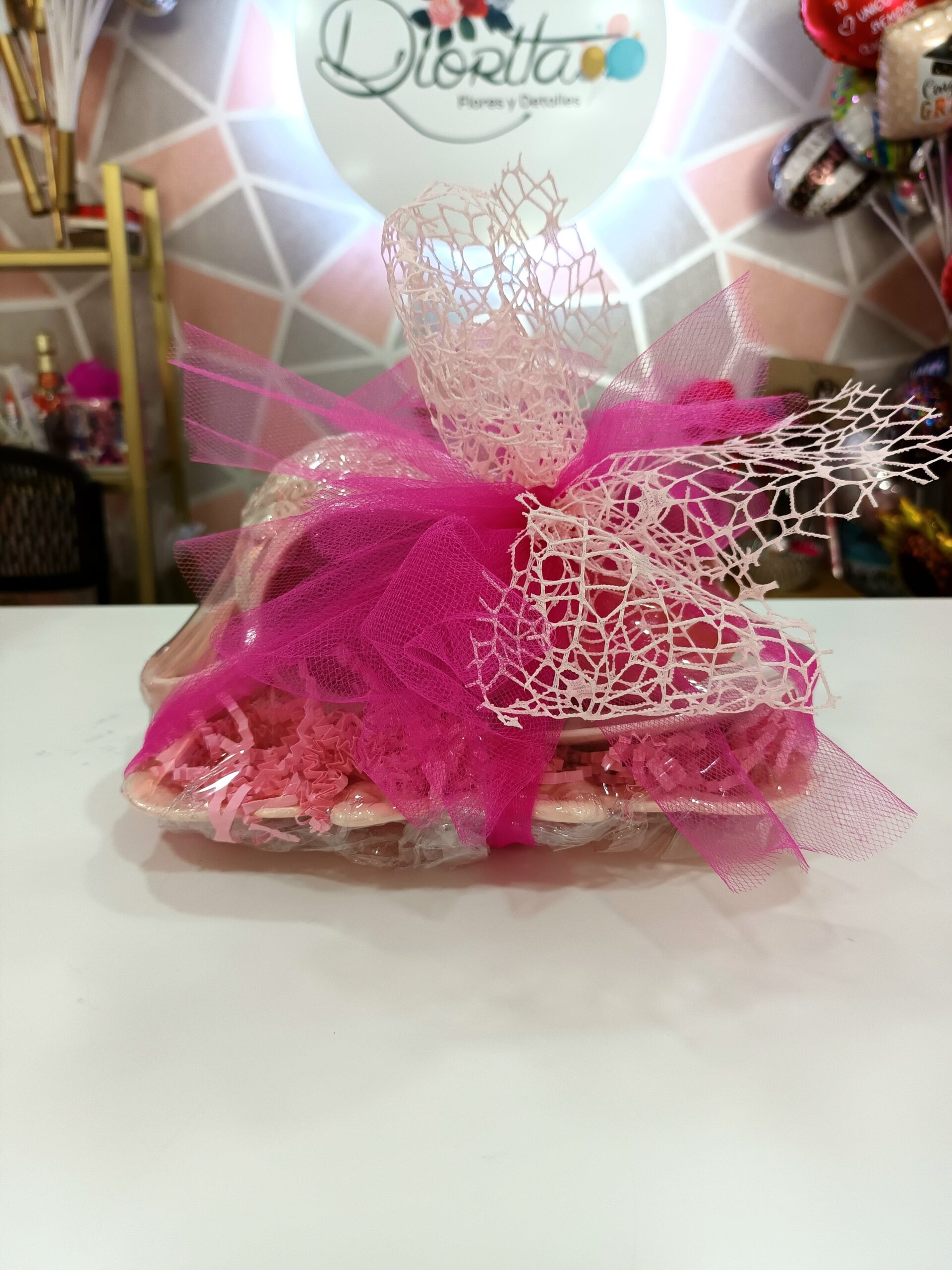 Delicada bandeja rosada con taza blanca, lechera y platito en forma de rosa. Envoltura con lazo doble de tela y malla. ¡Un detalle lleno de encanto!