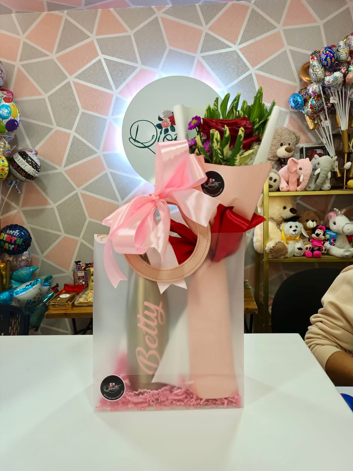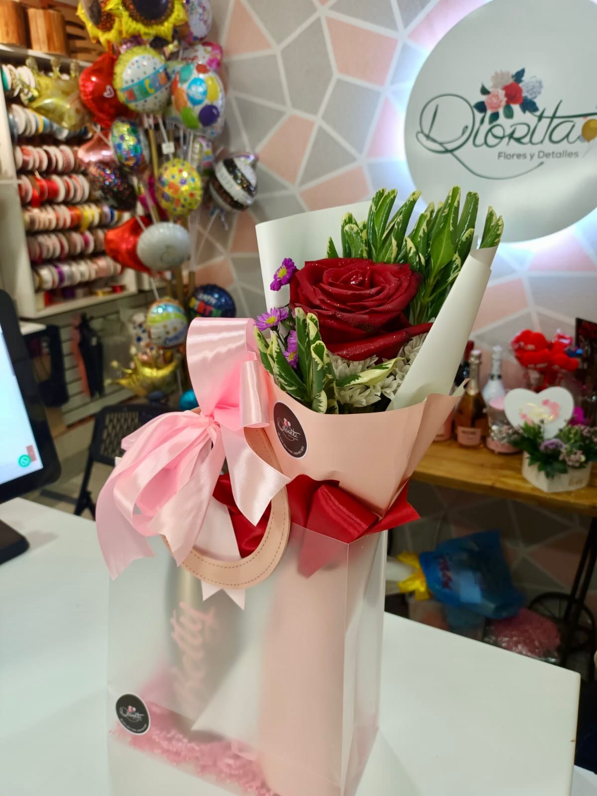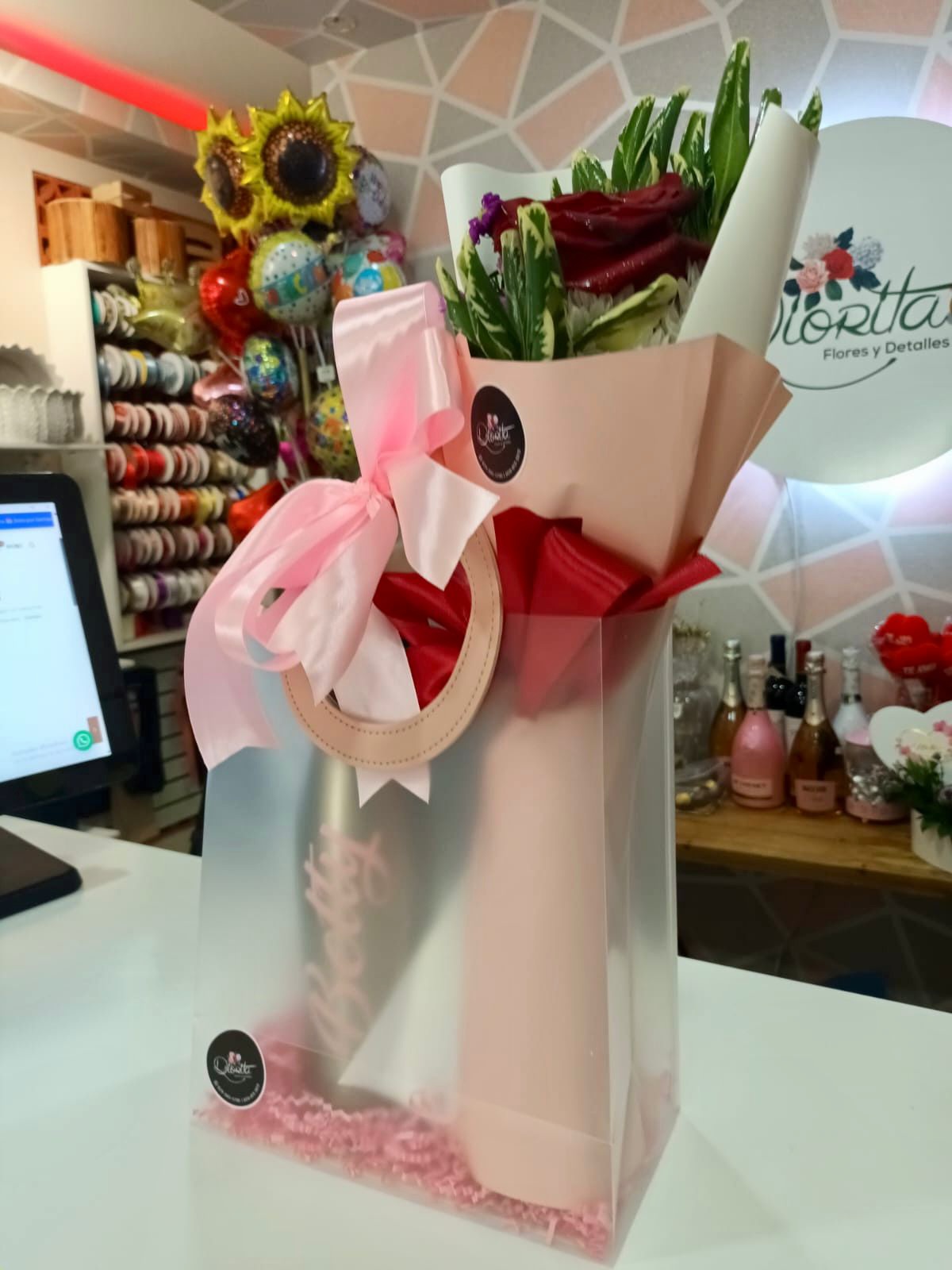 Una elegante combinación de rosas rojas y delicadas flores complementadas con follaje verde, presentadas en un exclusivo empaque transparente con asas y un lazo rosa. Perfecto para expresar amor, amistad o gratitud en cualquier ocasión especial. ¡Un regalo inolvidable para alegrar el día!