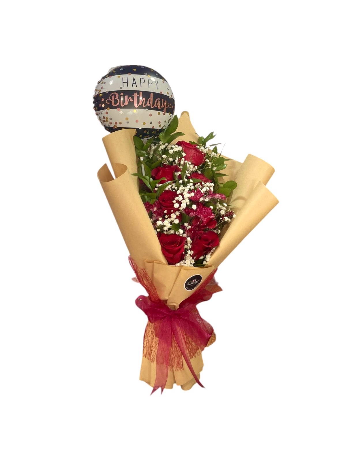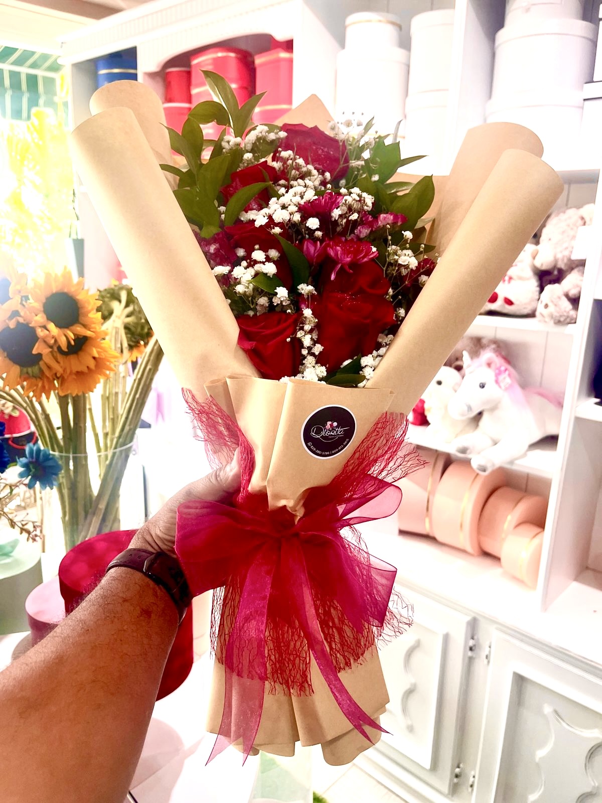 Bouquet de 08 rosas decoradas con baby breath y ruscus con detalles de statices. Envoltura papel Kraft.